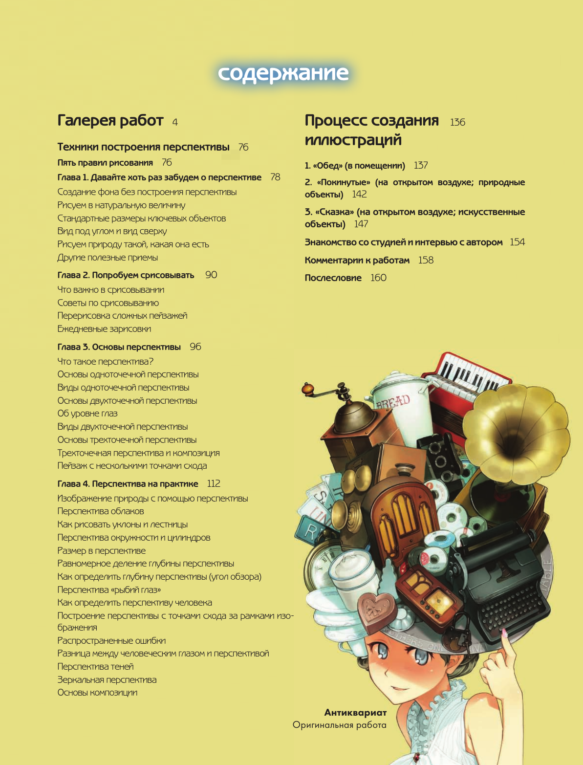 Этот артбук — не просто коллекция работ, а полноценный учебник по работе с иллюстрацией: если в первой части представлены только черновые эскизы вместе с рисунками на заказ, то во второй вы найдете целый гайд по работе с композицией и перспективой. Художник также разбирает собственные проекты, подробно расписывая каждый шаг создания артов.