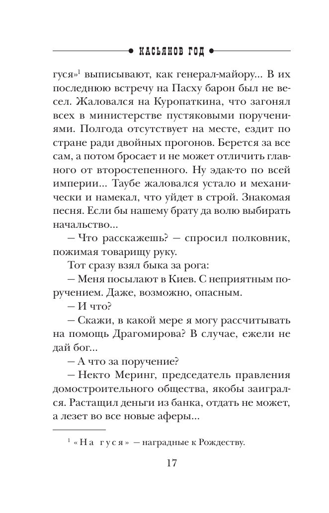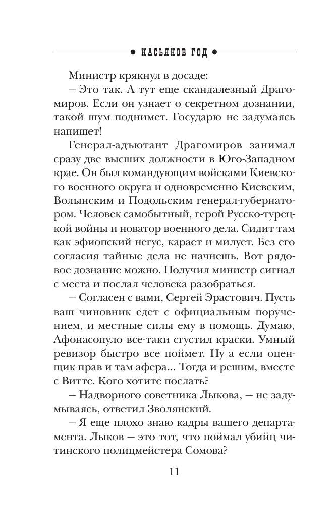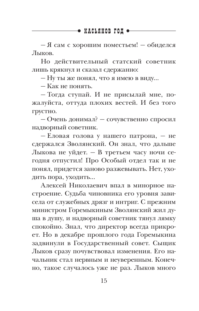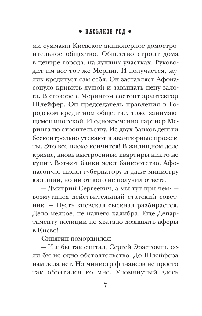 Действие романа происходит в 1900-м году. Год високосный, в народе его не любят, считается, что он приносит несчастья. По святцам 29 февраля - День святого Кассиана: по нему весь год называют Касьяновым. Вот и у Лыкова этот год не задался. По просьбе министра финансов Витте он отправляется в Киев. Зять Витте, Михаил Меринг, проводит рискованные аферы - он занимается жилищным строительством и, стараясь обмануть кредиторов, жульничает с залогами. Лыкову предстоит вывести его на чистую воду. Но в Киеве сыщика ждут сплошные неудачи. Дело осложняется тем, что начинают погибать люди, да и сам Лыков ходит по краю - на него разворачивается охота…