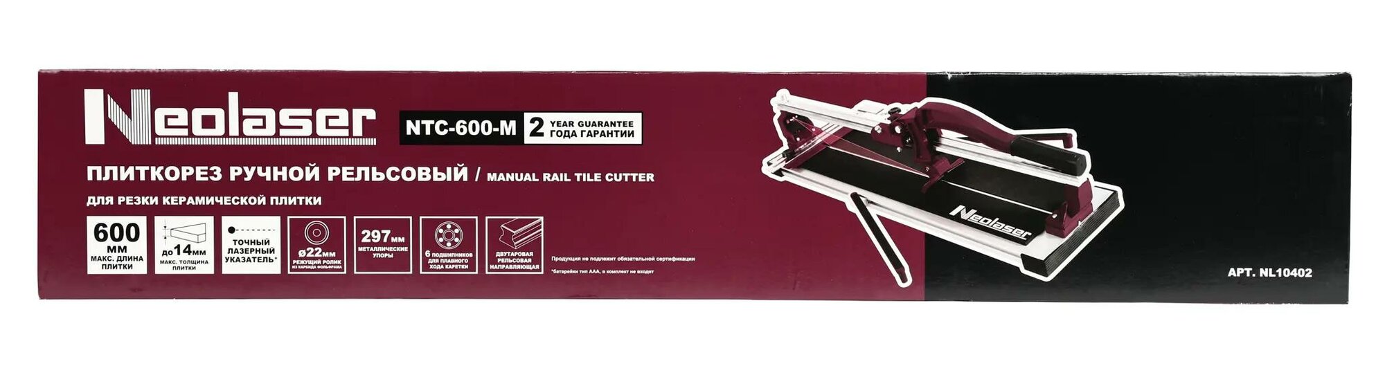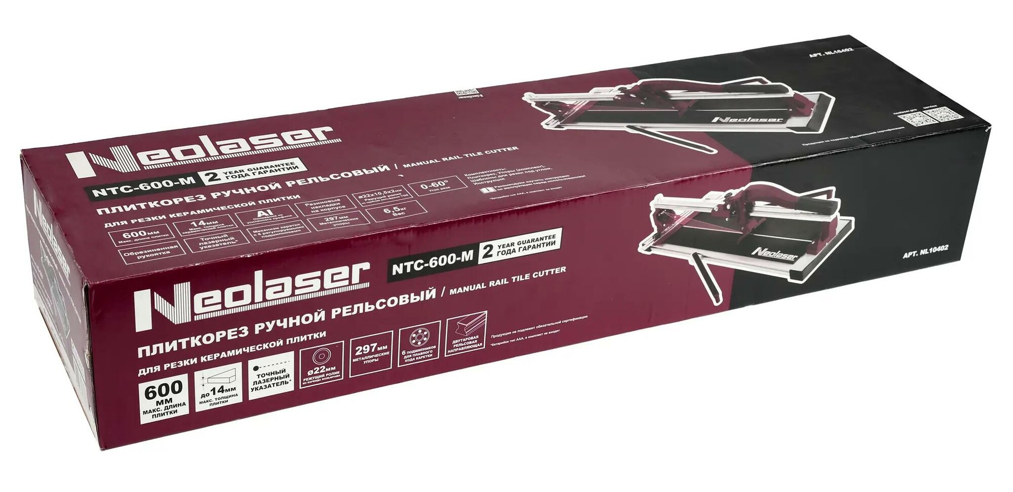 **Плиткорез ручной рельсовый Neolaser NTC-600-M** — инструмент, широко применяется в ремонтных и строительных работах. С его помощью можно разрезать плитку и получать таким способом более мелкие фрагменты. Процесс разделения материала не сопровождается большим количеством пыли и разбрызгиванием воды, как при использовании крупногабаритных станков. Уровень шума незначительный, что обеспечивает комфортную работу. Кроме того, ручной инструмент позволяет добиться высокого качества реза и отсутствие сколов — при условии, что у керамической плитки нет заводских дефектов. Режущим элементом служит ролик, выполненный из карбид вольфрама. Дополнительные опоры, которые расположены по двум сторонам основания, упрощают работу с плитками большого формата.