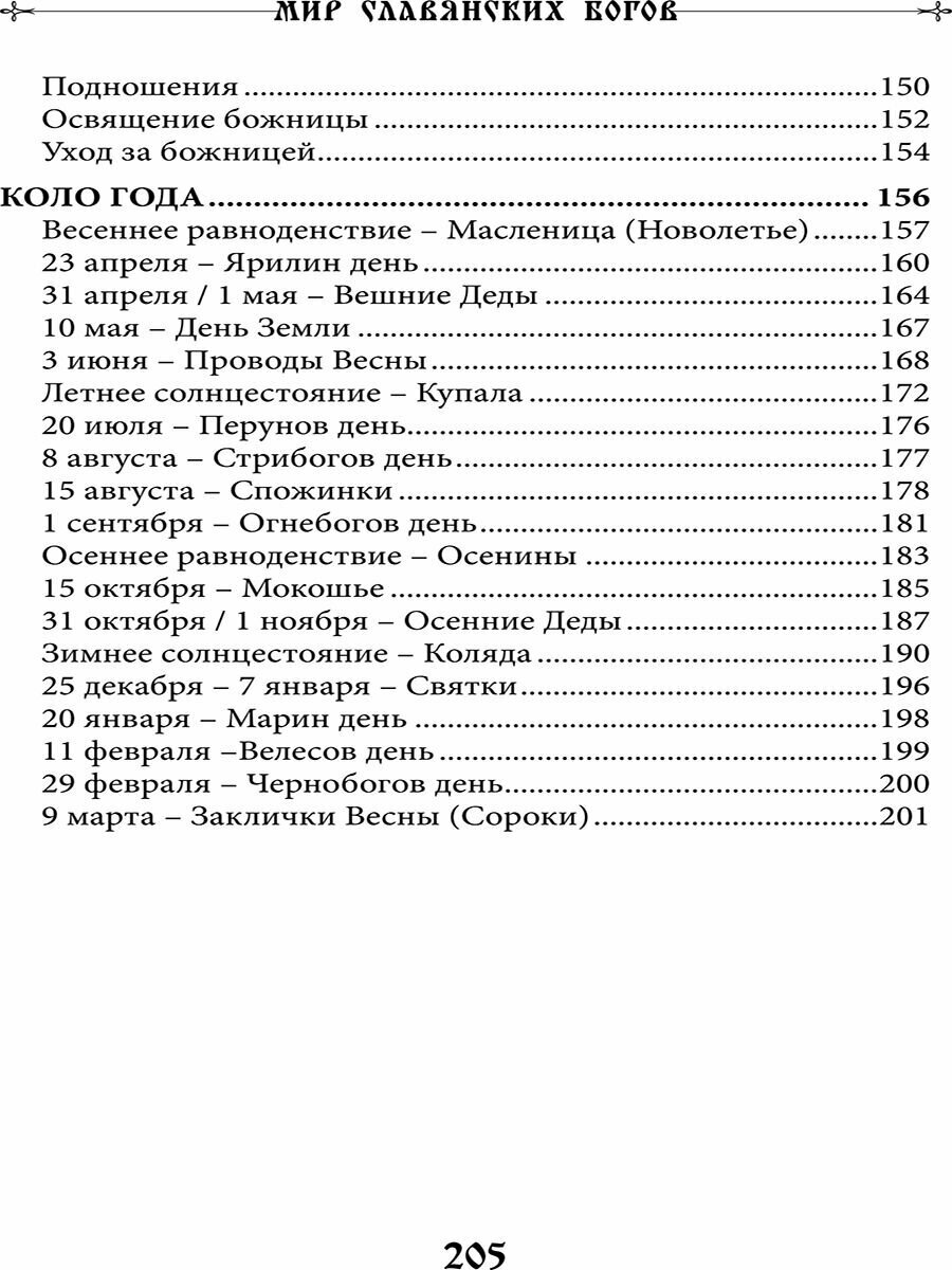 Во второй части книги приводится описание кологода - славянского календаря, с перечислением обрядов, игр, праздничных блюд, имен Богов, почитаемых в соответствующую дату. Далее рассказывается, как по уму обустроить в доме божницу - угол или полку, где размещаются изображения Богов и различные святыни.