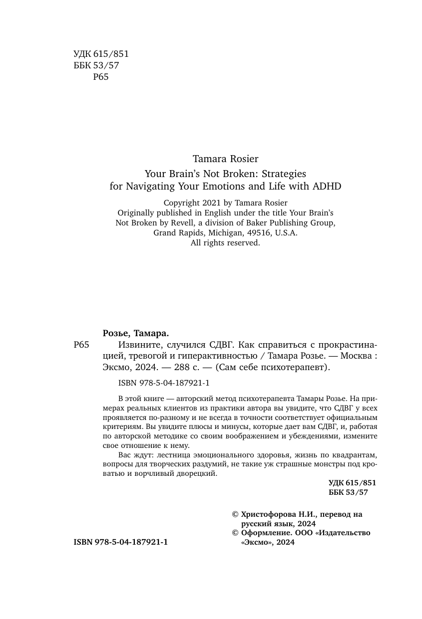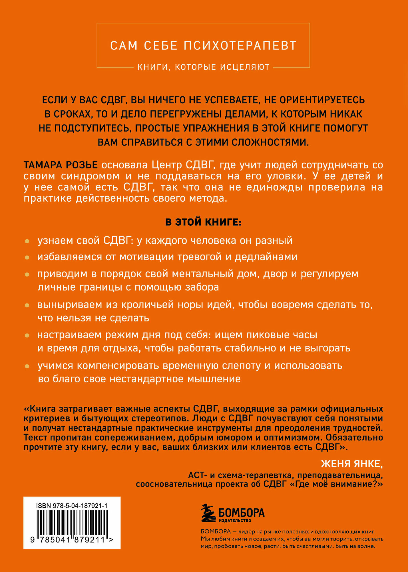 Смягчите проявления СДВГ с помощью авторского метода психотерапевта Тамары Розье. На примерах реальных клиентов из практики автора вы увидите, что СДВГ у всех проявляется по-разному и не всегда в точности соответствует официальным критериям. Вы увидите плюсы и минусы, которые дает вам СДВГ, и работая по авторской методике со своим воображением и убеждениями, измените свое отношение к нему.