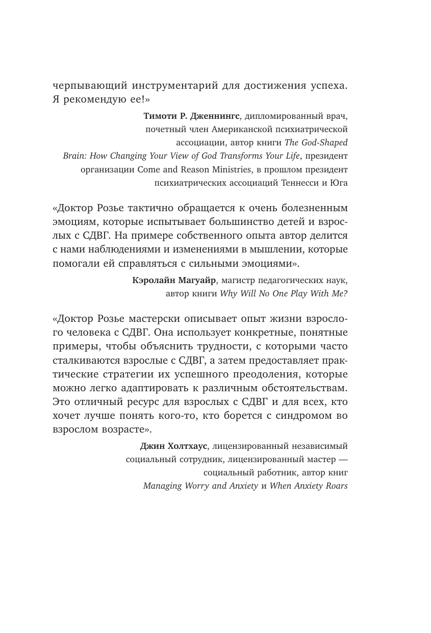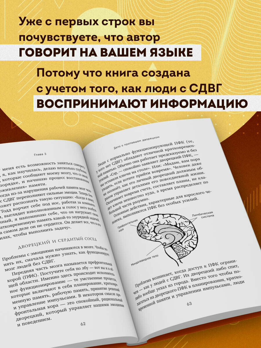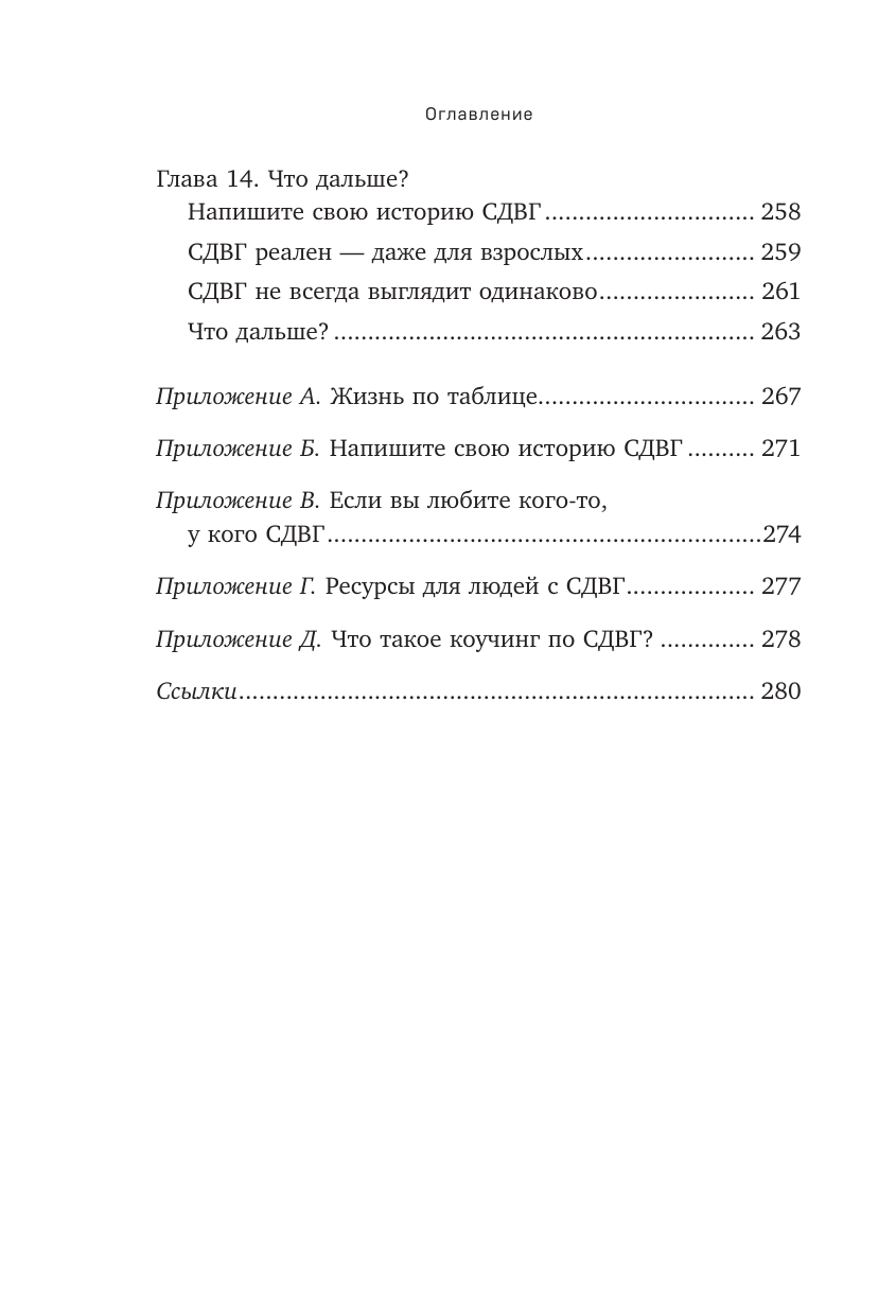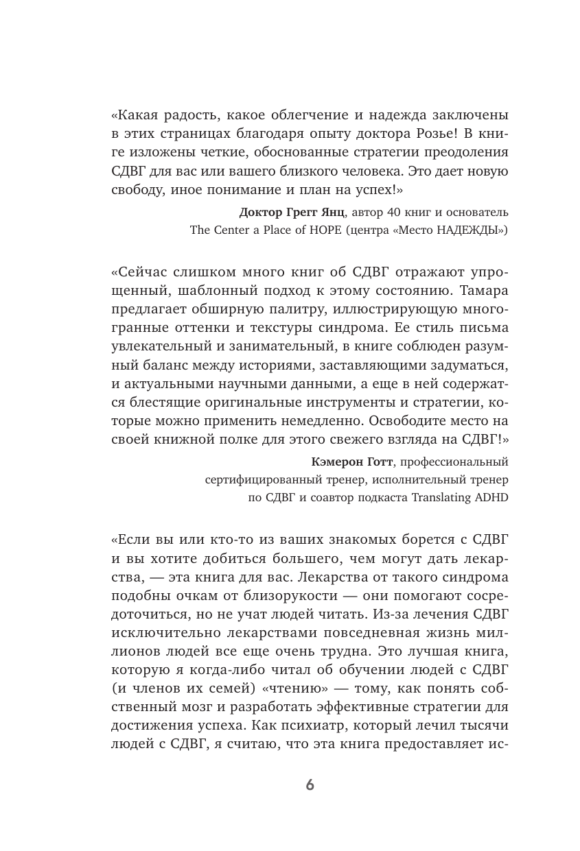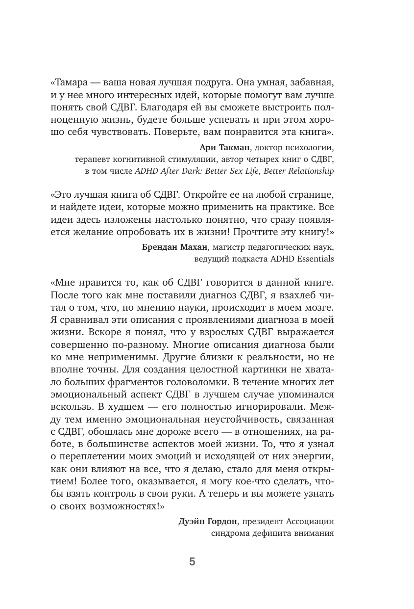 "Книга затрагивает важные аспекты СДВГ, выходящие за рамки официальных критериев и бытующих стереотипов. Люди с СДВГ почувствуют валидацию и получат нестандартные практические инструменты для преодоления трудностей. Текст пропитан сопереживанием, добрым юмором и оптимизмом. Обязательно прочтите эту книгу, если у вас, ваших близких или клиентов есть СДВГ".