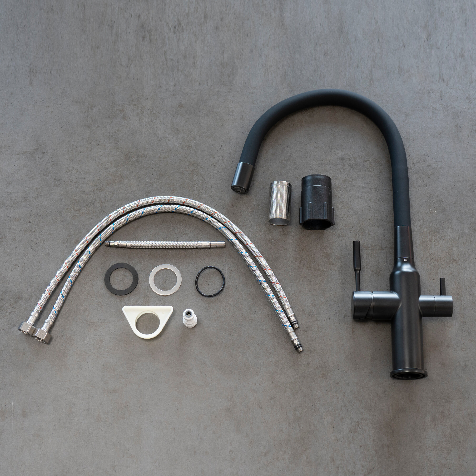 Смеситель Lemark Expert для кухни с гибким изливом и подключением к фильтру с питьевой водой это оптимальное решение для современных кухонь, где важны комфорт и функциональность. Эта модель объединяет в себе все преимущества, которые могут понадобиться в повседневной жизни, упрощая процесс использования как водопроводной, так и питьевой воды.Смеситель Expert создан с акцентом на эргономику и удобство. Благодаря гибкому изливу, вы можете легко направлять поток воды в нужное место, что делает его идеальным для мытья посуды, овощей и фруктов. Удобная система подключения к фильтру для питьевой воды позволяет избежать установки двух отдельных смесителей, что экономит пространство и время. В комплект входят высококачественные элементы, обеспечивающие надежность и долговечность. Комбинированный аэратор Neoperl® Perlator® Flow Thru гарантирует оптимальный расход воды, а керамический картридж Sedal® Cold Start Mirror с диаметром 35 мм обеспечивает плавное управление потоком и температурой воды. Уникальная кран-букса с керамическими пластинами для питьевой воды имеет угол поворота 90°, что делает её использование максимально удобным.Для подключения смесителя предусмотрены гибкие подводки: для водопроводной воды длиной 60 см, а для питьевой М8х11 длиной 17 см. Присоединительная группа для настольного крепления упрощает установку, а переходник позволяет подключить шланг от фильтра с питьевой водой без лишних усилий. Металлические рукоятки не только придают смесителю стильный вид, но и обеспечивают надежный захват.Смеситель Lemark Expert это идеальный выбор для тех, кто ценит качество и удобство в каждой детали. Он станет надежным помощником на вашей кухне, обеспечивая доступ к чистой питьевой воде и комфортное использование водопроводной воды в одном устройстве. Выбирая этот смеситель, вы выбираете функциональность, стиль и долговечность.
