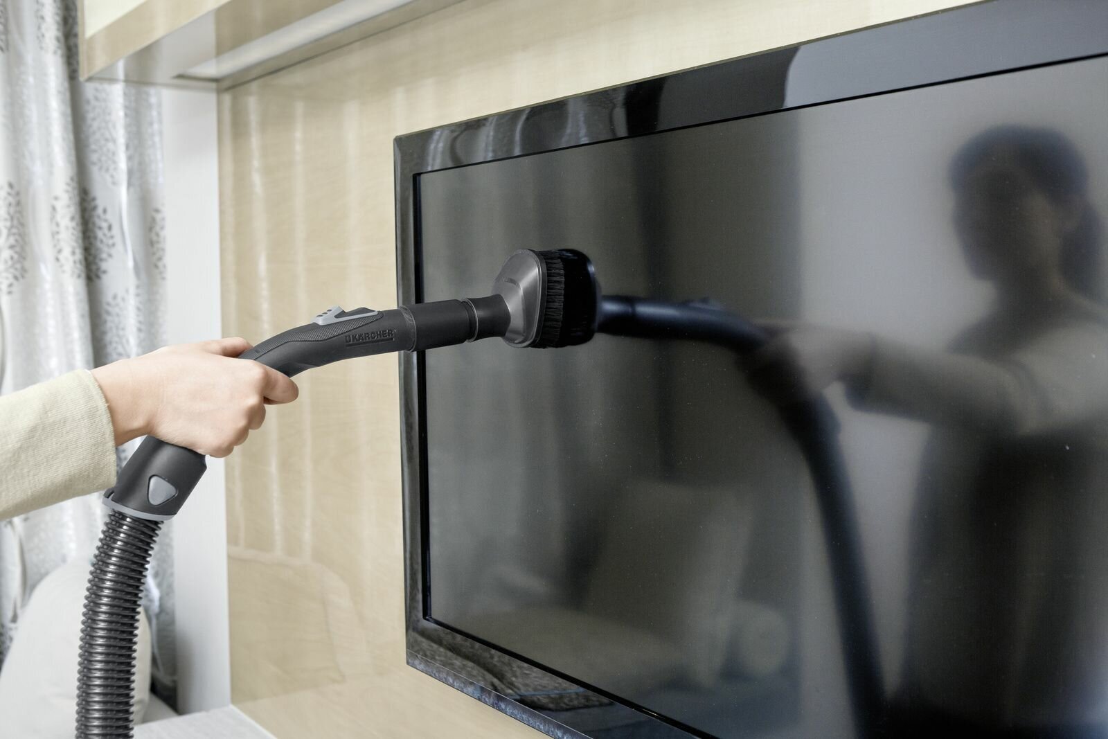 Пылесос Karcher снабжен высокотехнологичным двигателем, который создает высокую силу всасывания, потребляя всего 700 Вт. Кроме того, он не создает при работе сильного шума и легко перемещается в помещениях со сложной планировкой за счет малых размеров и применения поворотного ролика.