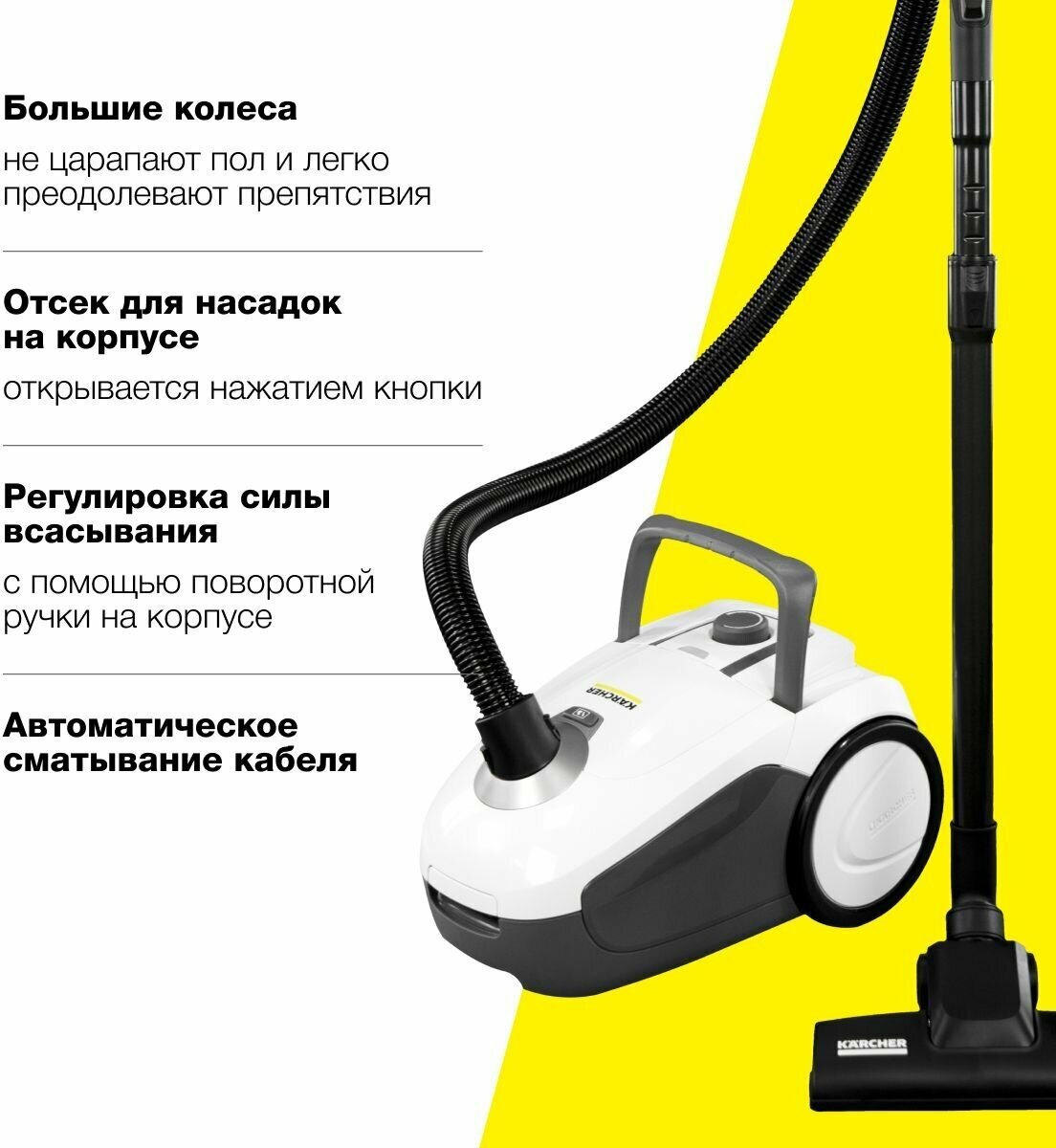 Гарантия 5 лет! Белый пылесос Керхер легко и просто справится с уборкой полов и ковров. Он без труда соберет пыль из труднодоступных мест. А благодаря удобству системы сбора пыли в фильтр мешок нет необходимости контактировать с пылью снова – просто утилизируйте его как бытовые отходы. Продуманная система хранения аксессуаров на самом пылесосе не даст возможности потерять насадки. За счет компактных размеров и отличного дизайна пылесос органично вписывается в интерьер дома.