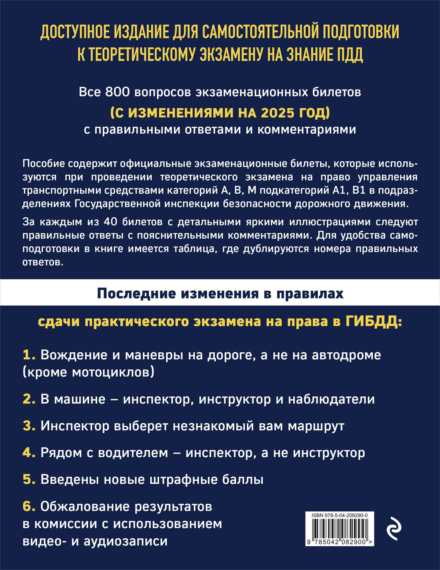 Доступное издание для самостоятельной подготовки к теоретическому экзамену на знание ПДД. Содержит все 800 вопросов экзаменационных билетов (с изменениями на 2024 год).За каждым из 40 билетов с детальными яркими иллюстрациями следуют правильные ответы с пояснительными комментариями. Для удобства самоподготовки в книге имеется таблица, где дублируются номера правильных ответов.