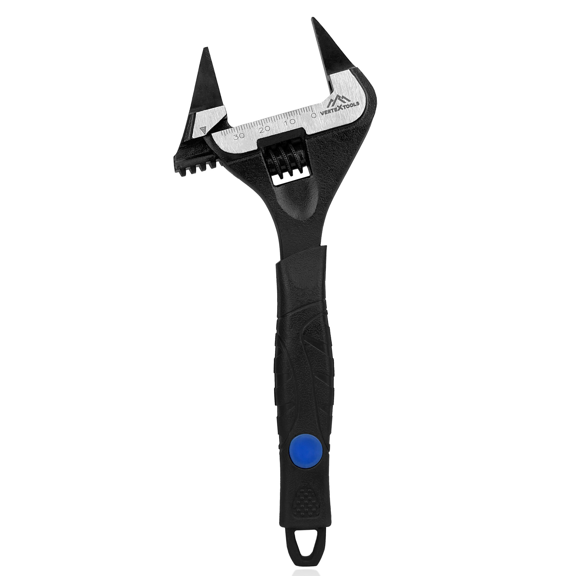 **Ключ разводной Vertextools** с диапазоном раскрытия 41 мм и тонкими прямыми губками подходит для работ с крепежом различных конфигураций. Произведен из прочного хром ванадиевого сплава. Для установки губок на нужное расстояние, на них нанесена градуировка, а на подвижной части — точечная риска. Ручки покрыты резиновым чехлом для предотвращения скольжения.