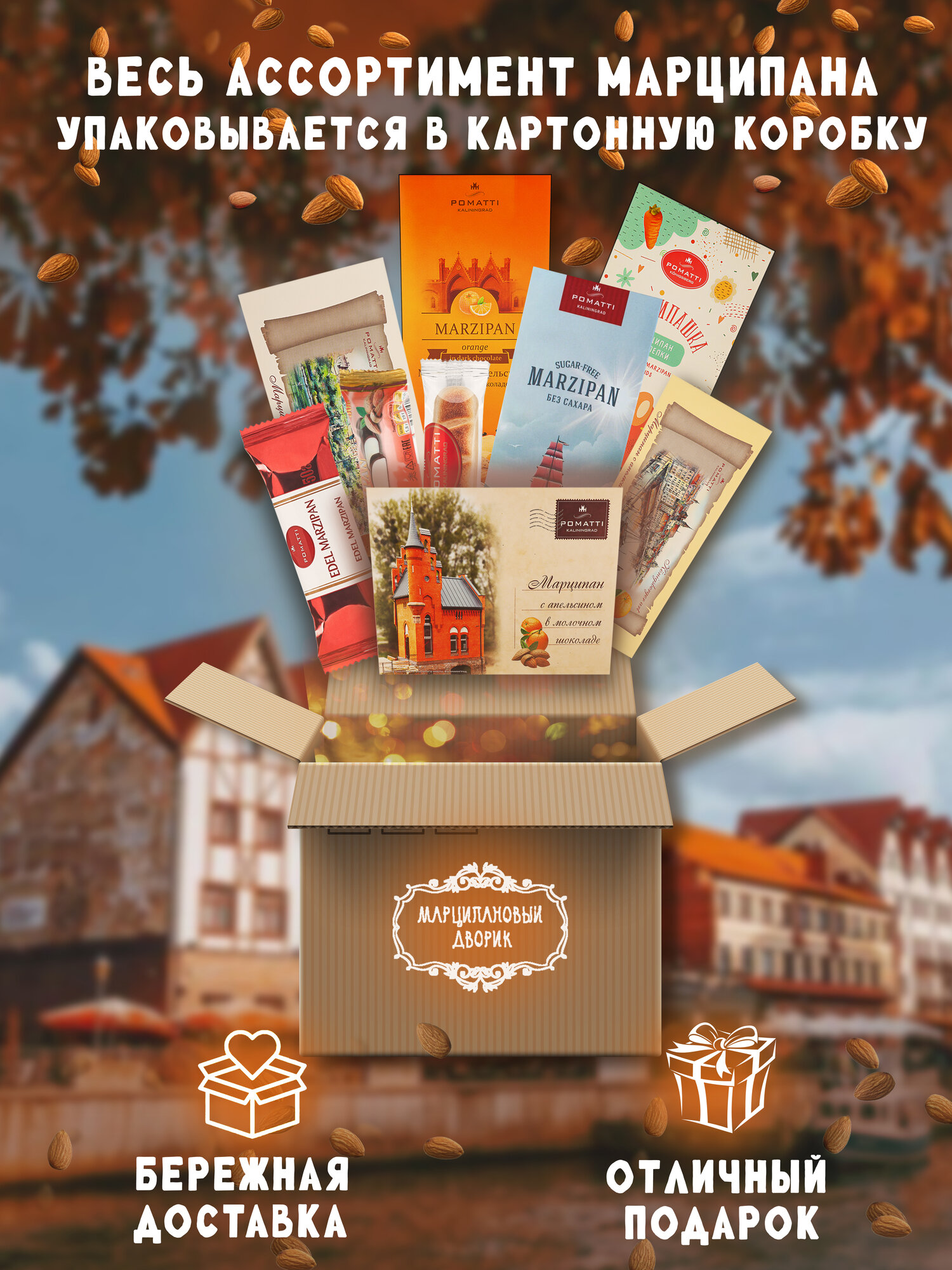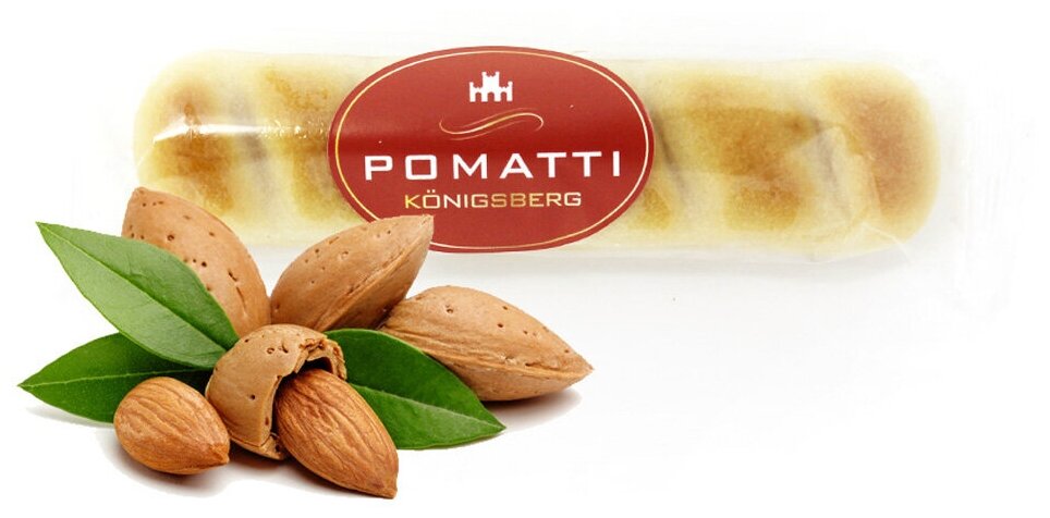 Марципановый батончик Pomatti изготовлен по рецепту Кёнигсберга без пальмового масла и ГМО. Лакомство из Калининграда имеет красивый золотистый оттенок за счет того, что батончик был запечен в печи. Нежный и ароматный десерт на основе миндаля преобразит ваш кофе-брейк и поднимет настроение на целый день!Произведено в соответствии с ГОСТ стандартами.