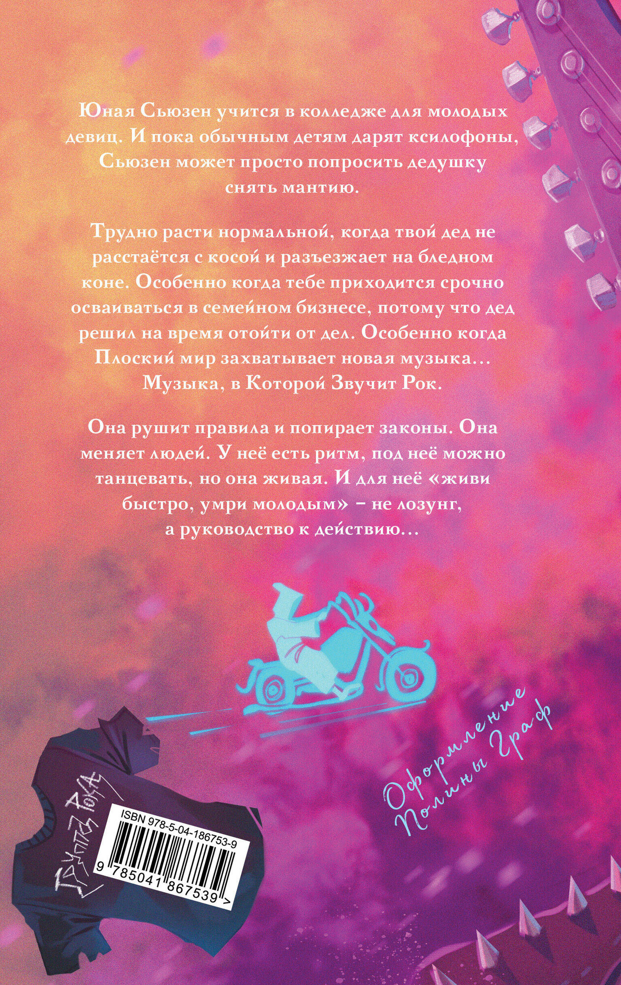 Юная Сьюзен учится в колледже для молодых девиц. И пока обычным детям дарят ксилофоны, Сьюзен может просто попросить дедушку снять мантию. Трудно расти нормальной, когда твой дед не расстаётся с косой и разъезжает на бледном коне. Особенно когда тебе приходится срочно осваиваться в семейном бизнесе, потому что дед решил на время отойти от дел. Особенно когда Плоский мир захватывает новая музыка… Музыка, в Которой Звучит Рок. Она рушит правила и попирает законы. Она меняет людей. У неё есть ритм, под неё можно танцевать, но она живая. И для неё «живи быстро, умри молодым» – не лозунг, а руководство к действию…