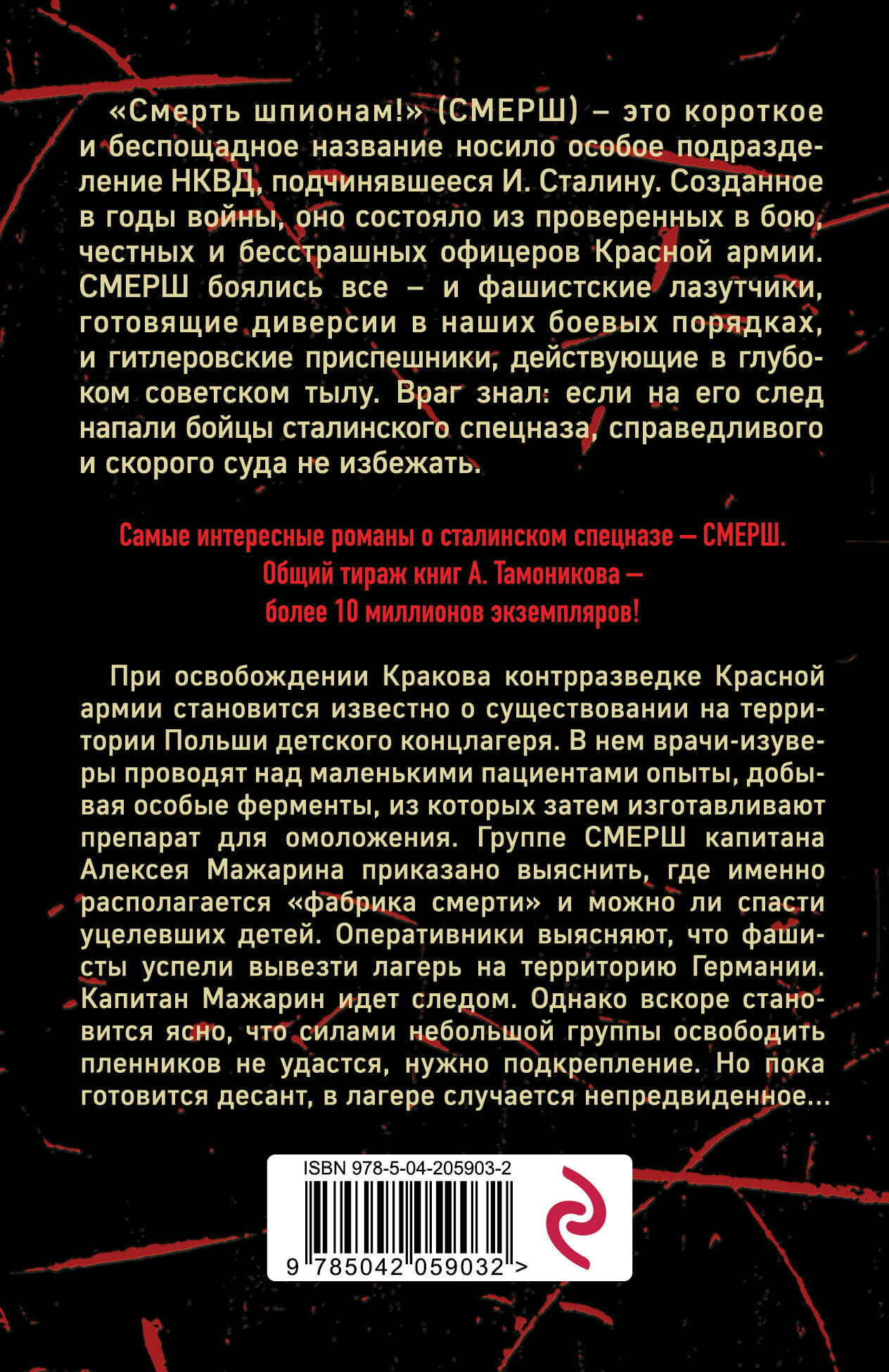 При освобождении Кракова контрразведке Красной Армии становится известно о существовании на территории Польши детского концлагеря. В нем врачи-изуверы проводят над маленькими пациентами опыты, добывая особые ферменты, из которых затем изготавливают препарат для омоложения. Группе СМЕРШа капитана Алексея Мажарина приказано выяснить, где именно располагается «фабрика смерти» и можно ли спасти уцелевших детей. Оперативники выясняют, что фашисты успели вывезти лагерь на территорию Германии. Капитан Мажарин идет следом. Однако вскоре становится ясно, что силами небольшой группы освободить пленников не удастся, нужно подкрепление. Но пока готовится десант, в лагере случается непредвиденное…