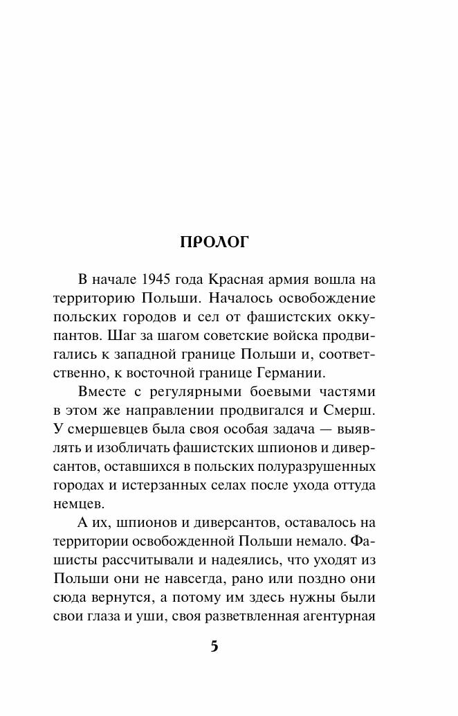 «Смерть шпионам!» (СМЕРШ) — это короткое и беспощадное название носило особое подразделение НКВД, подчинявшееся И. Сталину. Созданное в годы войны, оно состояло из проверенных в бою, честных и бесстрашных офицеров Красной Армии. СМЕРШа боялись все — и фашистские лазутчики, готовящие диверсии в наших боевых порядках, и гитлеровские приспешники, действующие в глубоком советском тылу. Враг знал: если на его след напали бойцы сталинского спецназа, справедливого и скорого суда не избежать.
