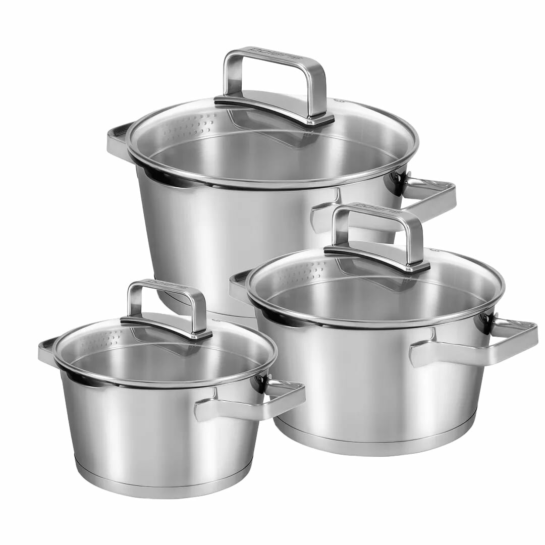 Начну с внешнего вида. Кастрюли выглядят солидно, без лишнего гламура, но с ощущением добротной вещи. Сталь блестит, швы ровные, ничего не болтается. Крышки стеклянные, через них удобно следить за приготовлением, и, что особенно нравится, есть отверстия для выхода пара — теперь не нужно каждый раз поднимать крышку, чтобы посмотреть, не убежало ли.
