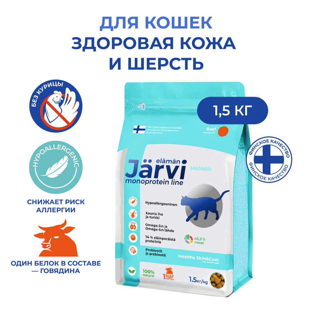 Jarvi монопротеиновый сухой корм для кошек это сбалансированный рацион, специально разработанный для поддержания здоровья кожи и красоты шерсти кошек. Особенности корма для кошек сухого Ярви:1. Говядина (33%) единственный источник животного белка в составе сухого корма для кошек. Монопротеиновый корм снижает риск возникновения аллергии и уменьшает нагрузку на пищеварение. 2. Рис и ячмень легкоусвояемые углеводы, которые способствуют здоровью пищеварительной системы и обеспечивают питомцу энергию для активной жизни. 3. Омега-6 жирные кислоты снижают риск развития сухости, зуда, и перхоти, а также способствуют улучшению состояния кожи и шерсти.4. Масло лосося и пивные дрожжи источники Омега-3 жирных кислот и витамина В, играют важную роль в поддержании здоровья кожи, шерсти и нервной системы. 5. Jarvi гипоаллергенный корм для кошек не содержит искусственных красителей, ароматизаторов или консервантов.Польза:- Снижение риска пищевой аллергии- Поддержание здорового пищеварения- Здоровая кожа и красивая шерсть- Укрепление нервной системыРазнообразьте рацион питомца влажными кормами и лакомствами Jarvi это будет стимулировать его аппетит и послужит дополнительным источником влаги, витаминов и минералов.