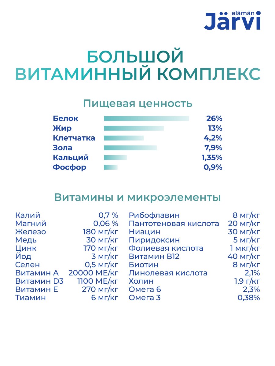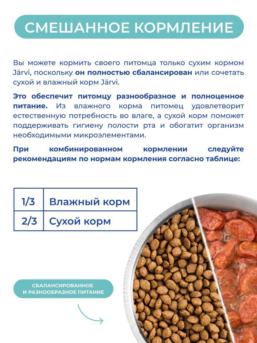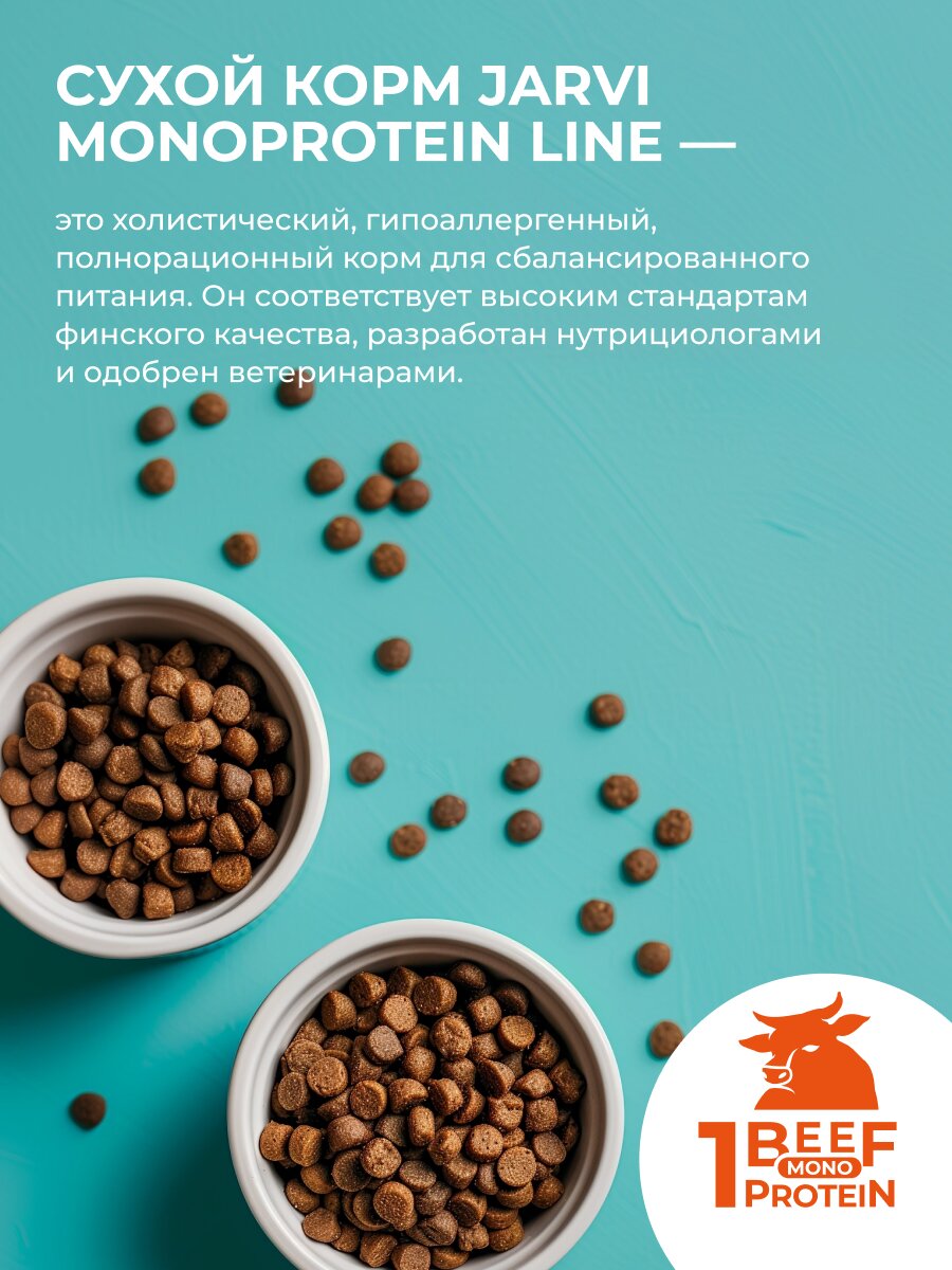 Сухой корм Jarvi Monoprotein Line – это холистический, гипоаллергенный, полнорационный корм для сбалансированного питания. Он соответствует высоким стандартам финского качества, разработан нутрициологами и одобрен ветеринарами.В составе корма используется только один источник животного белка, что делает его подходящим для питомцев, предрасположенных к пищевой непереносимости, повышенной чувствительности кишечника и кожи. В Jarvi Monoprotein Line содержится от 63 до 82% животного белка, что делает корм идеальным для ежедневного потребления и удовлетворения всех потребностей вашего питомца.Кроме того, содержание всех необходимых витаминов и микроэлементов способствует полноценному развитию, поддержке здоровой кожи и шерсти, укреплению опорно-двигательного аппарата и сердечно-сосудистой системы вашего питомца. Естественные источники FOS, MOS, пробиотический и пребиотический комплекс обеспечивают здоровую микрофлору кишечника и, следовательно, хорошее пищеварение. Смесь натуральных трав (экстракт эхинацеи, расторопша, розмарин) обладает антиоксидантным свойством, поддерживая иммунитет питомца и повышая сопротивляемость организма к различным заболеваниям.Широкий ассортимент Jarvi Monoprotein Line позволит вам подобрать корм, подходящий под индивидуальные особенности вашего домашнего животного.