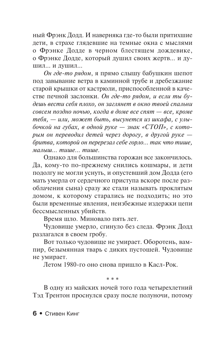 Стивен Кинг — один из самых популярных писателей современности. За свою долгую и насыщенную карьеру он написал порядка 70 бестселлеров, которые переведены на 44 языка, изданы в 80 странах и разошлись по свету тиражом свыше 400 000 000 экземпляров.
