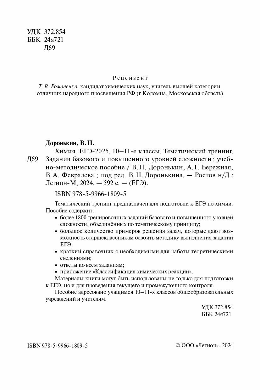 Химия. ЕГЭ-2025. 10-11-е классы. Тематический тренинг. Задания базового и повышенного уровней сложности: учебно-методическое пособие (Доронькин Владимир Николаевич, Бережная Александра Григорьевна, Февралева Валентина Александровна); Легион, 2024