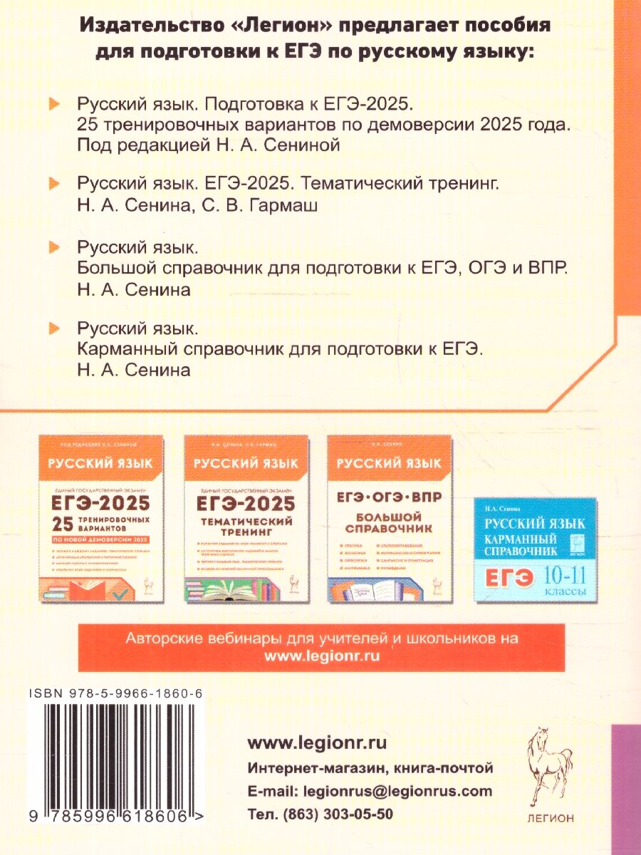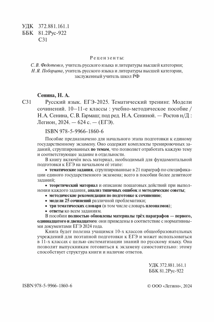 ЕГЭ-2025. Русский язык. 10-11 классы. Тематический тренинг. Модели сочинений (Сенина Наталья Аркадьевна, Гармаш Светлана Васильевна); Легион, 2025