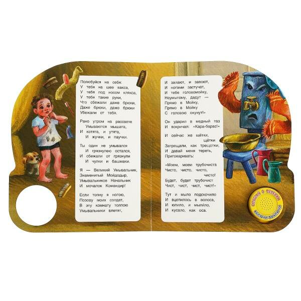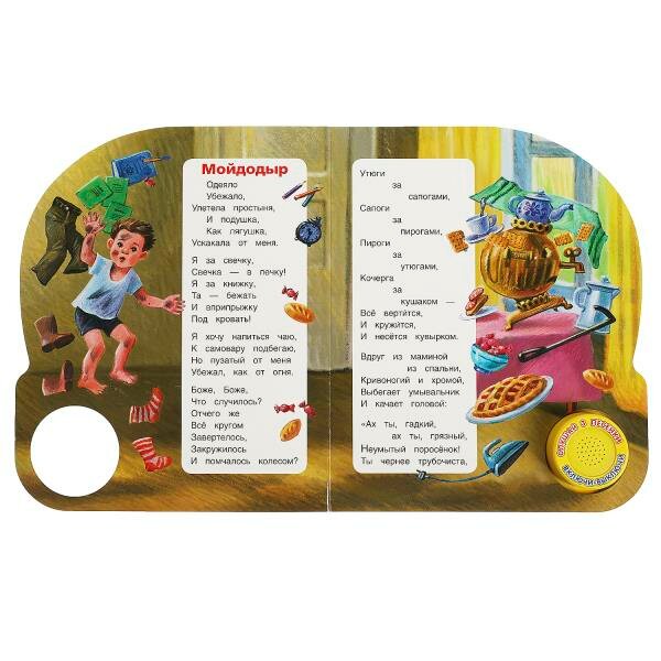Ребёнок с удовольствием будет листать плотные страницы, рассматривать красочные картинки, вместе с родителями читать известную стихотворную сказку Корнея Чуковского и, конечно, нажимать на кнопку и слушать весёлые песенки. Малыш легко освоит включение звука: по нажатию на кнопку песенка включится, при втором нажатии выключится, при третьем - заиграет следующая композиция. Благодаря компактному размеру книгу удобно взять с собой в дорогу.