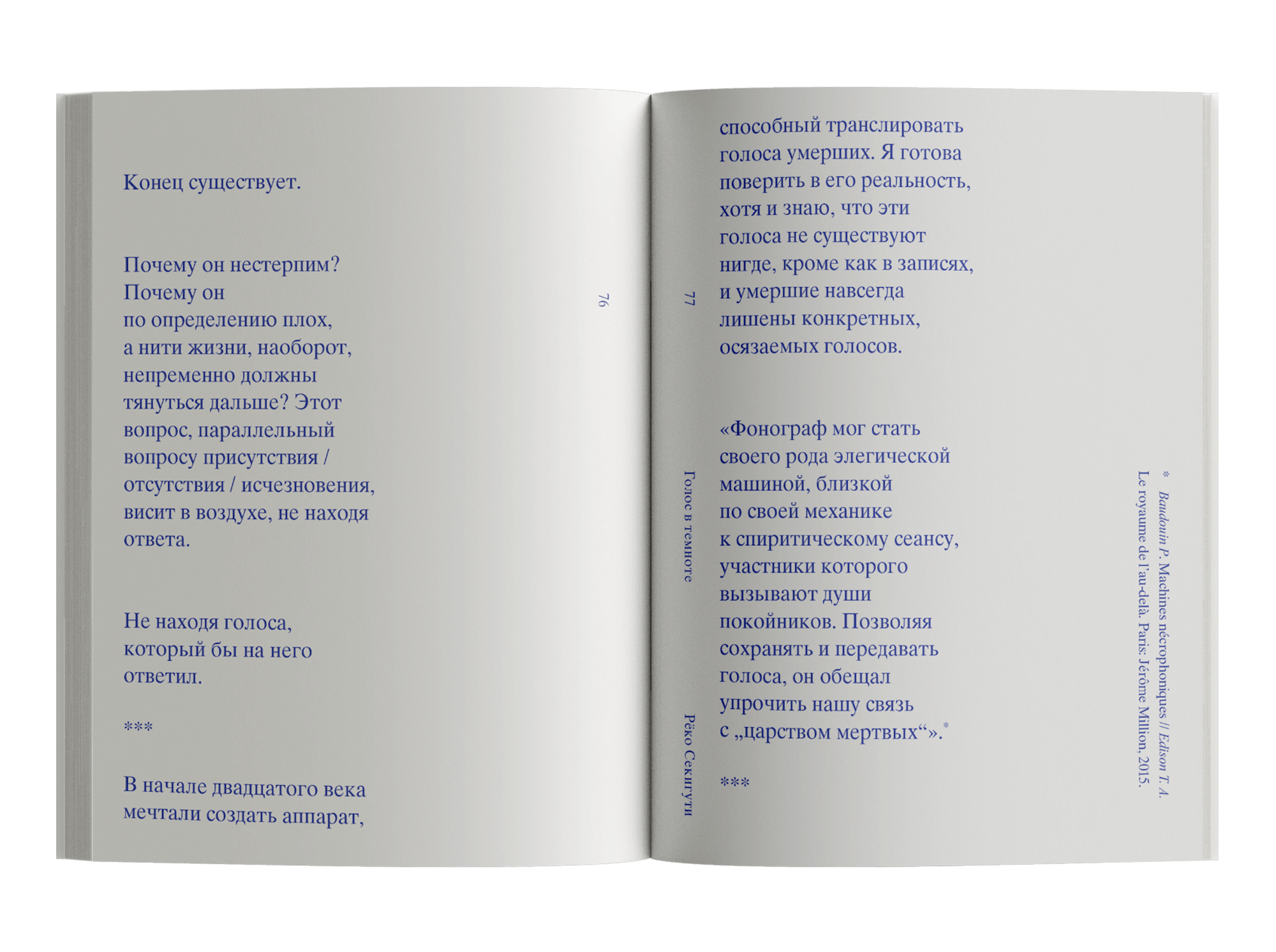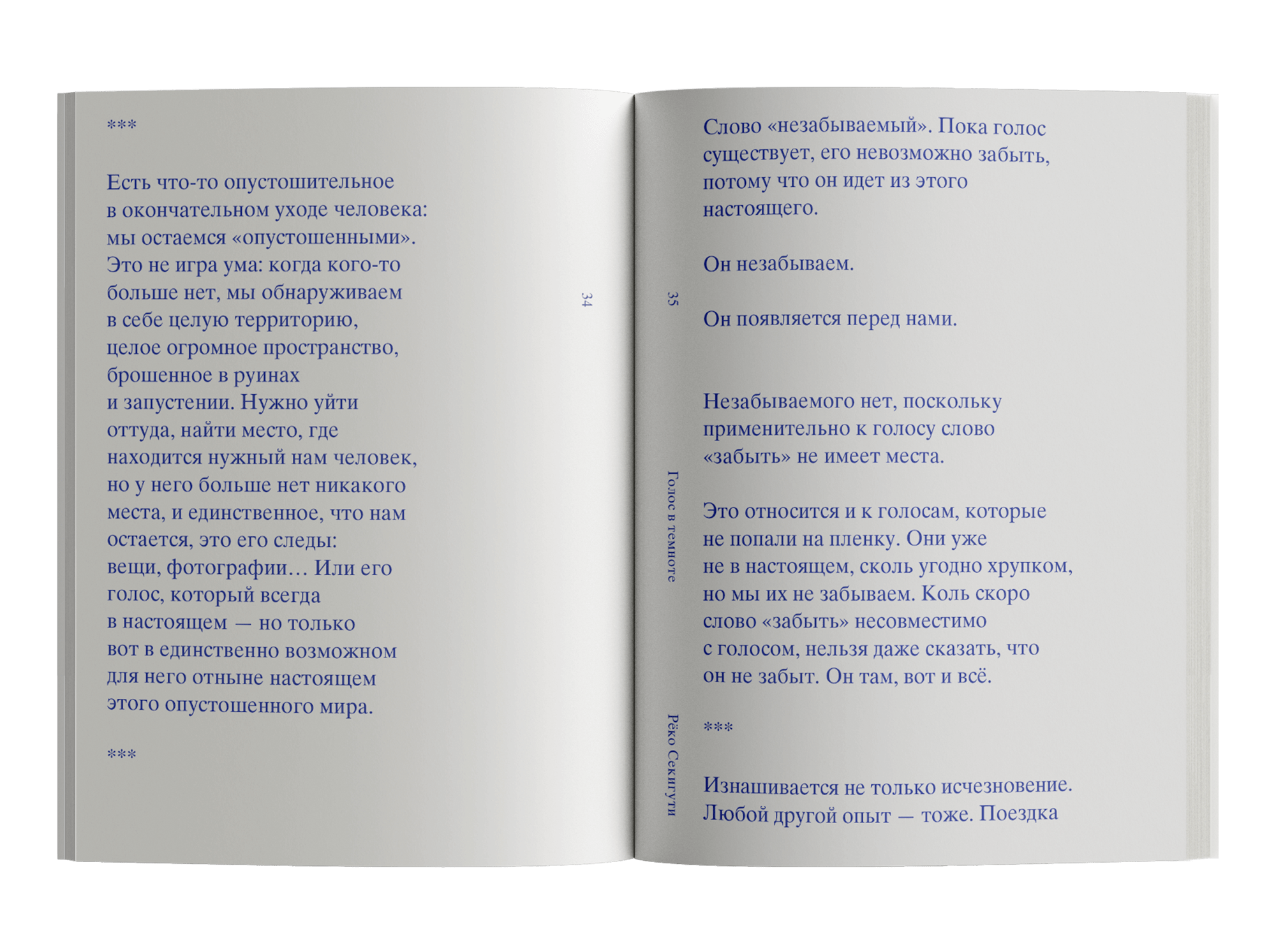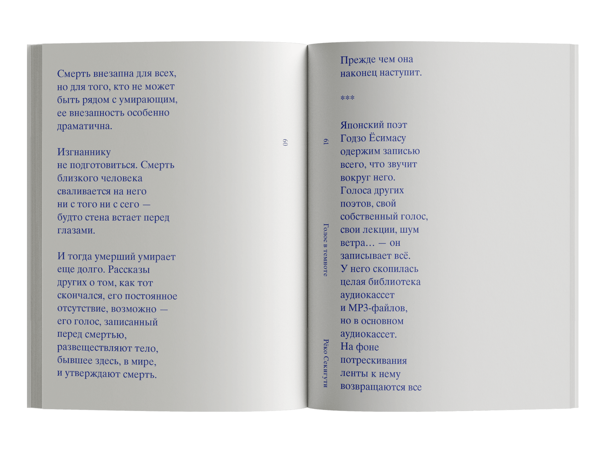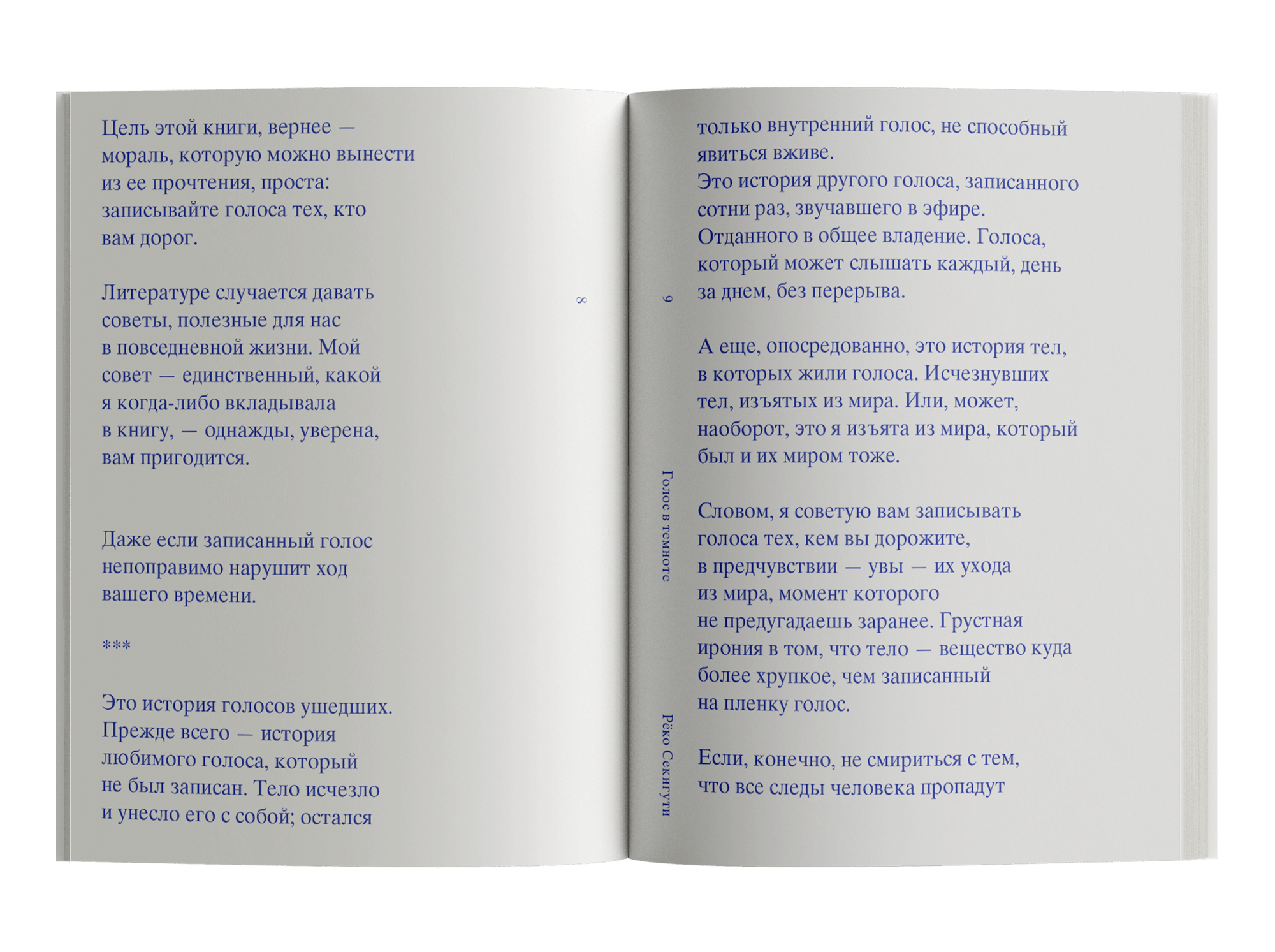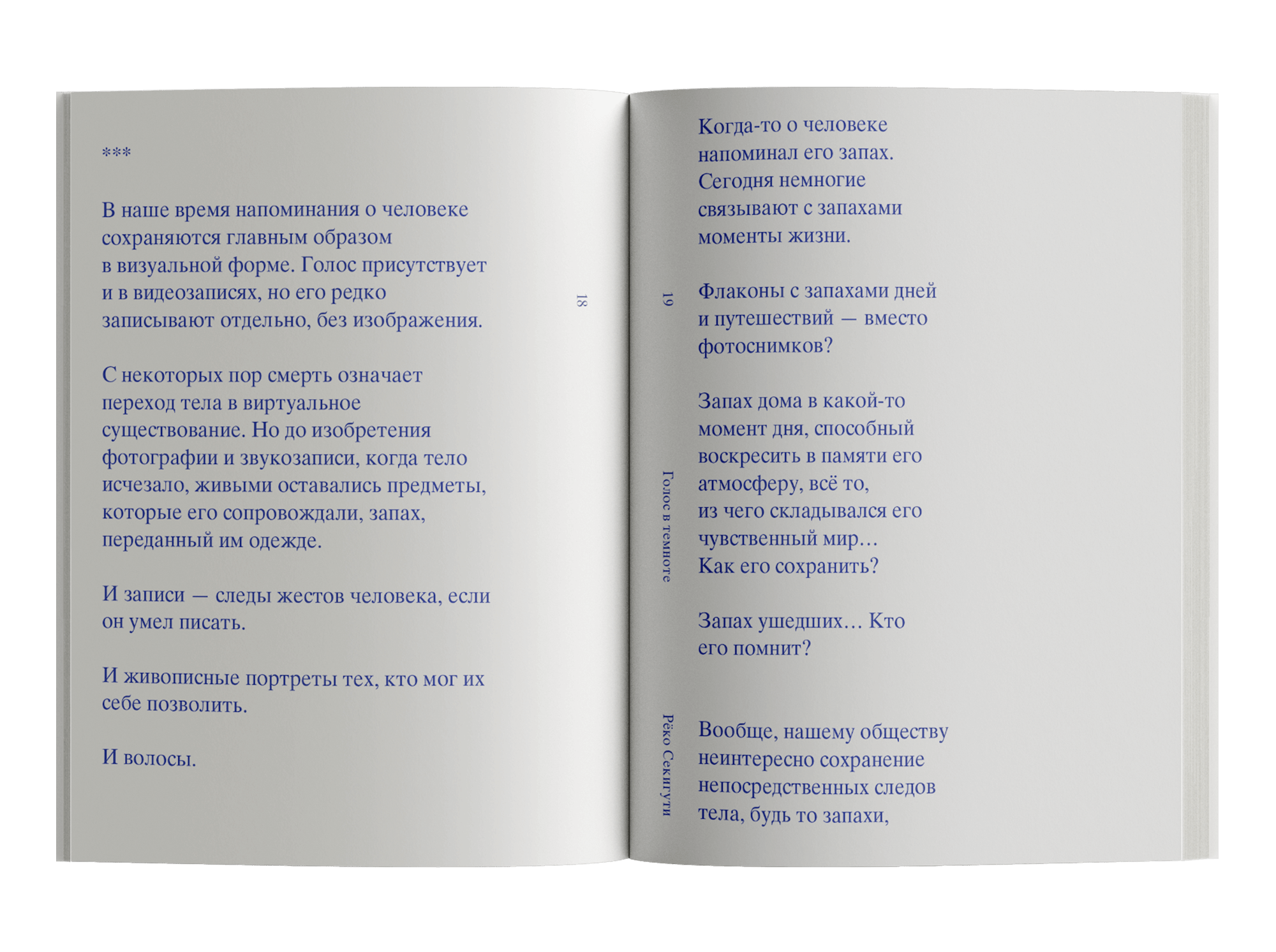 Рёко Секигути, японская поэтесса и французская эссеистка, автор переведенных на русский язык книг «Нагори» и «961 час в Бейруте», всегда, что бы ни становилось темой ее произведений — японские представления о смене сезонов, жизнь многоликого и многоголосого левантийского города, трагедия в Фукусиме и т. д. — пишет о том, как устроено время и как мы с ним «договариваемся», помня, забывая, смакуя мгновения и не замечая пролетающих лет. В этом коротком тексте, соединяющем в себе черты дневниковых заметок, стихотворения в прозе и философского эссе, проявителем времени становится человеческий голос, парадоксальным образом всегда существующий в настоящем.