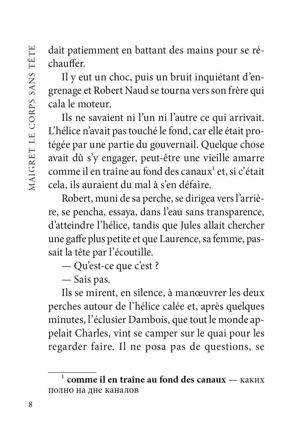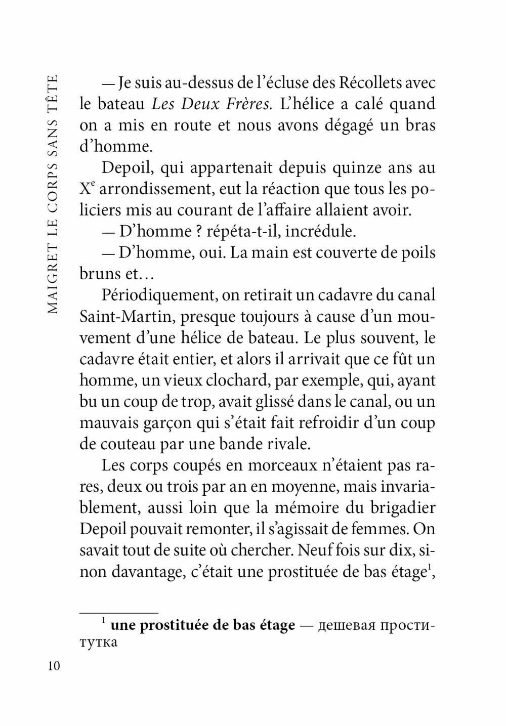 Романы Сименона о комиссаре Мегрэ отличаются от большинства других детективов, в основе которых — сложные преступления, а их расследование напоминает хитроумную головоломку. Герои романов Сименона — обыкновенные люди, которые совершают преступление не в силу своих наклонностей, а под давлением обстоятельств, оказавшихся сильнее их, а писатель ставит себе целью объяснить социальные мотивы преступления.В винт проходившей по каналу Сен-Мартен в Париже баржи попала человеческая рука. Очевидцы вызвали полицию, и штатному полицейскому водолазу удалось извлечь все фрагменты тела, за исключением головы. Установить личность погибшего и тем более найти преступника очень сложно, но комиссар Мегрэ берется за расследование, и ему это удается.В книге представлен неадаптированный текст романа, снабженный комментариями и словарем.