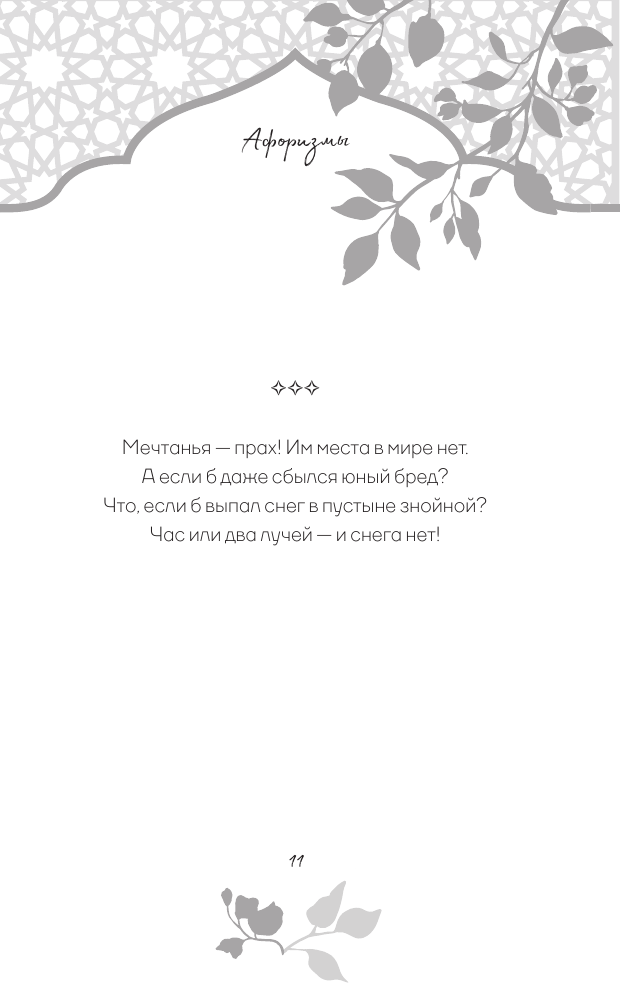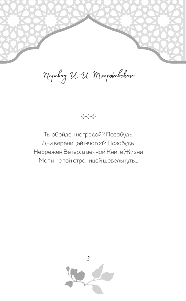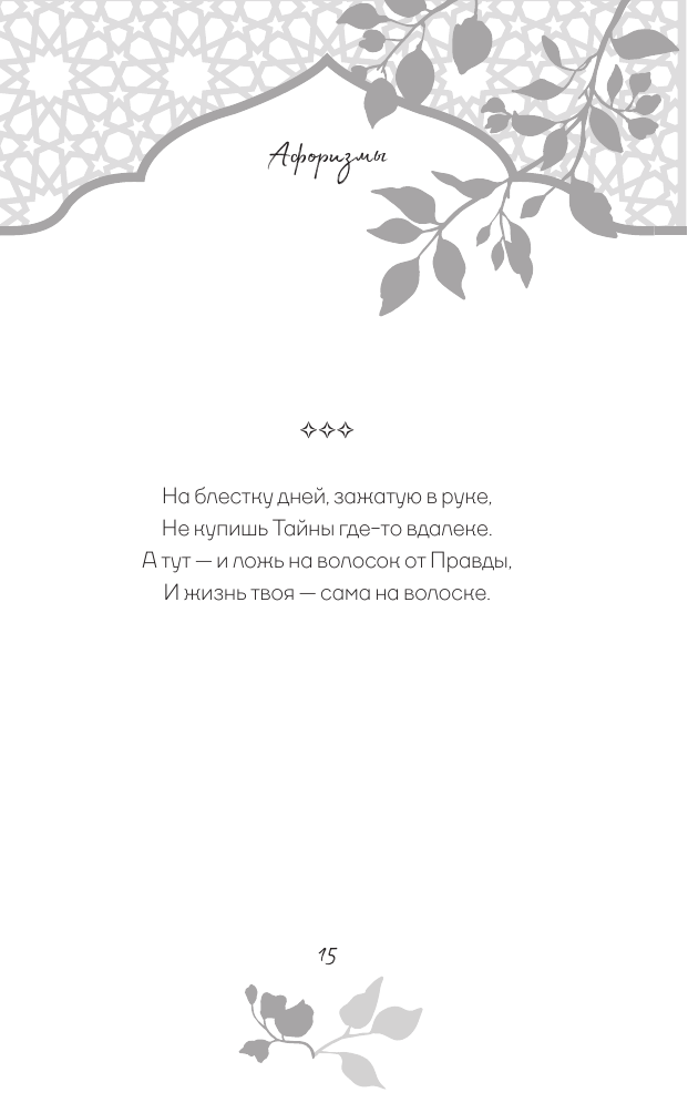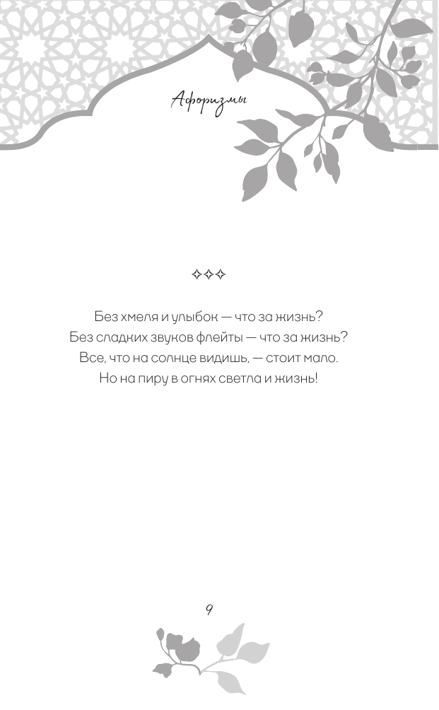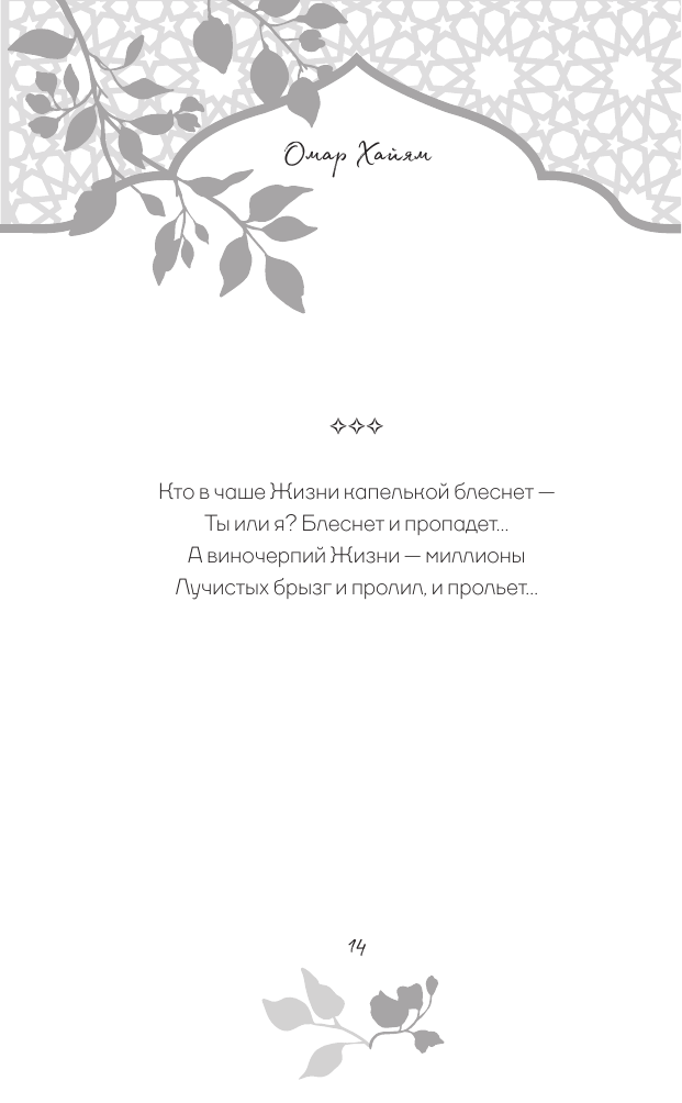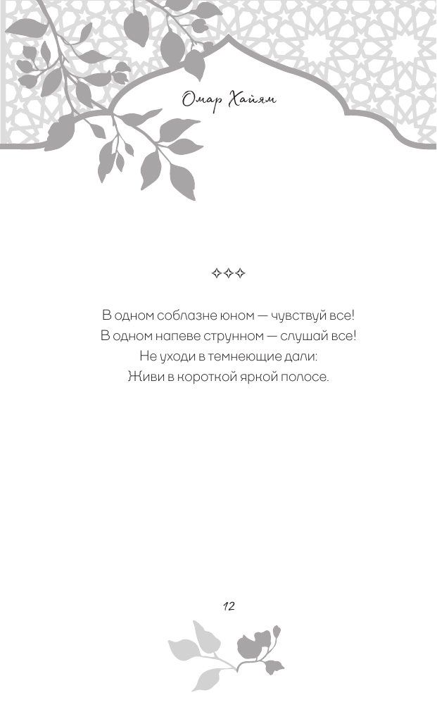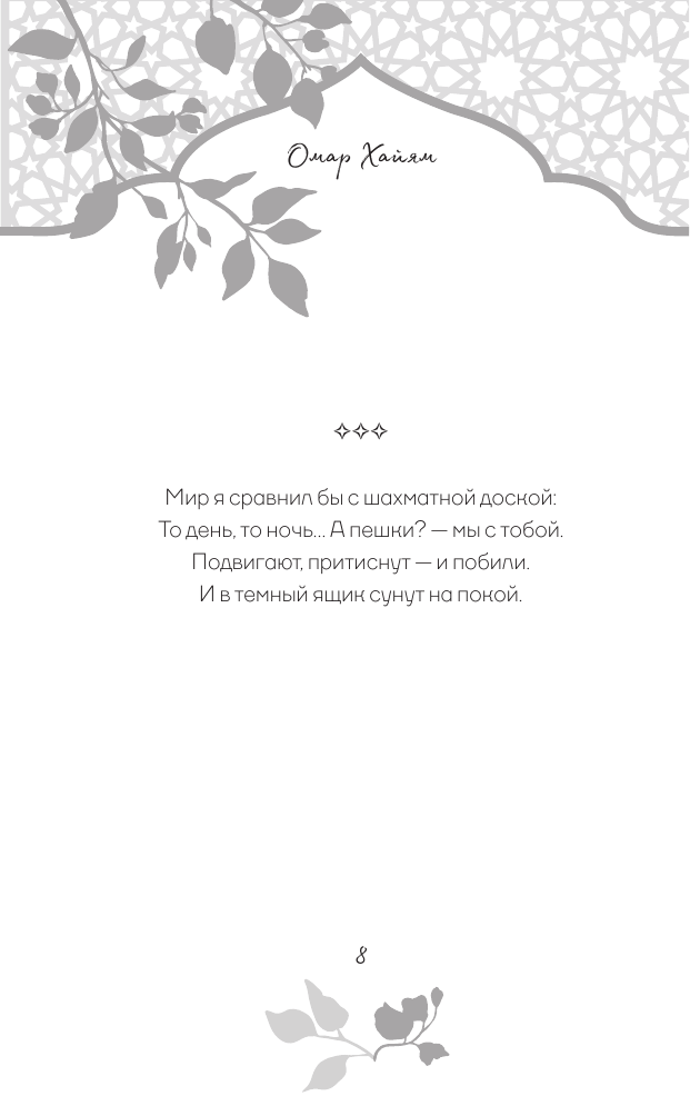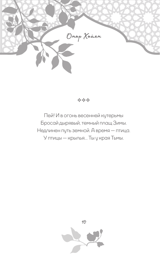 В этой книге собраны стихотворные афоризмы Хайяма в лучших русских переводах. О чем они? О красоте жизни и неизбежности смерти, о любви и о судьбе. Лирический герой выступает то мудрецом, созерцающим вечность, то пройдохой-весельчаком, то отчаявшимся человеком, который вступает в спор с самим Богом. Изящные и емкие четверостишия Хайяма дарят пищу для размышлений, утешают в горе и неизменно восхищают читателей всех времен своей красотой.