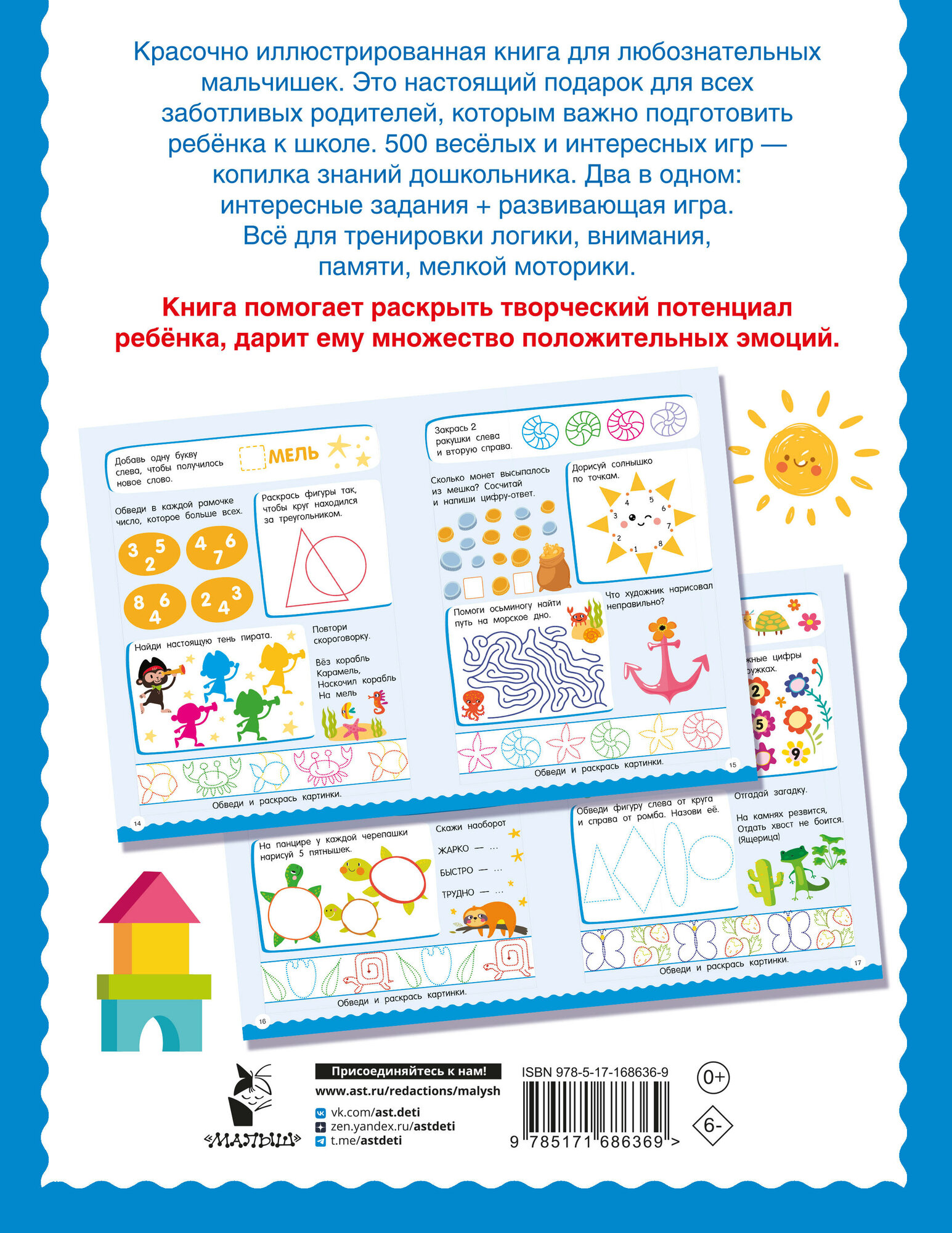 "500 увлекательных заданий для мальчиков. 5—7 лет" — много-много головоломок, игр с буквами и словами, сравнилок, находилок, дорисовашек, ребусов, бродилок и лабиринтов, загадок, задачек на логику и сообразительность. Предложите компании мальчишек угадывать зашифрованные слова, сравнивать картинки в поисках отличий, считать, размышлять, находить закономерности, проходить лабиринты — такие интеллектуальные занятия расширяют кругозор и словарный запас, формируют графические навыки, развивают мышление, память, внимание, наблюдательность, смекалку и творческие способности. Ребёнок откроет первую страницу — и уже не сможет оторваться!