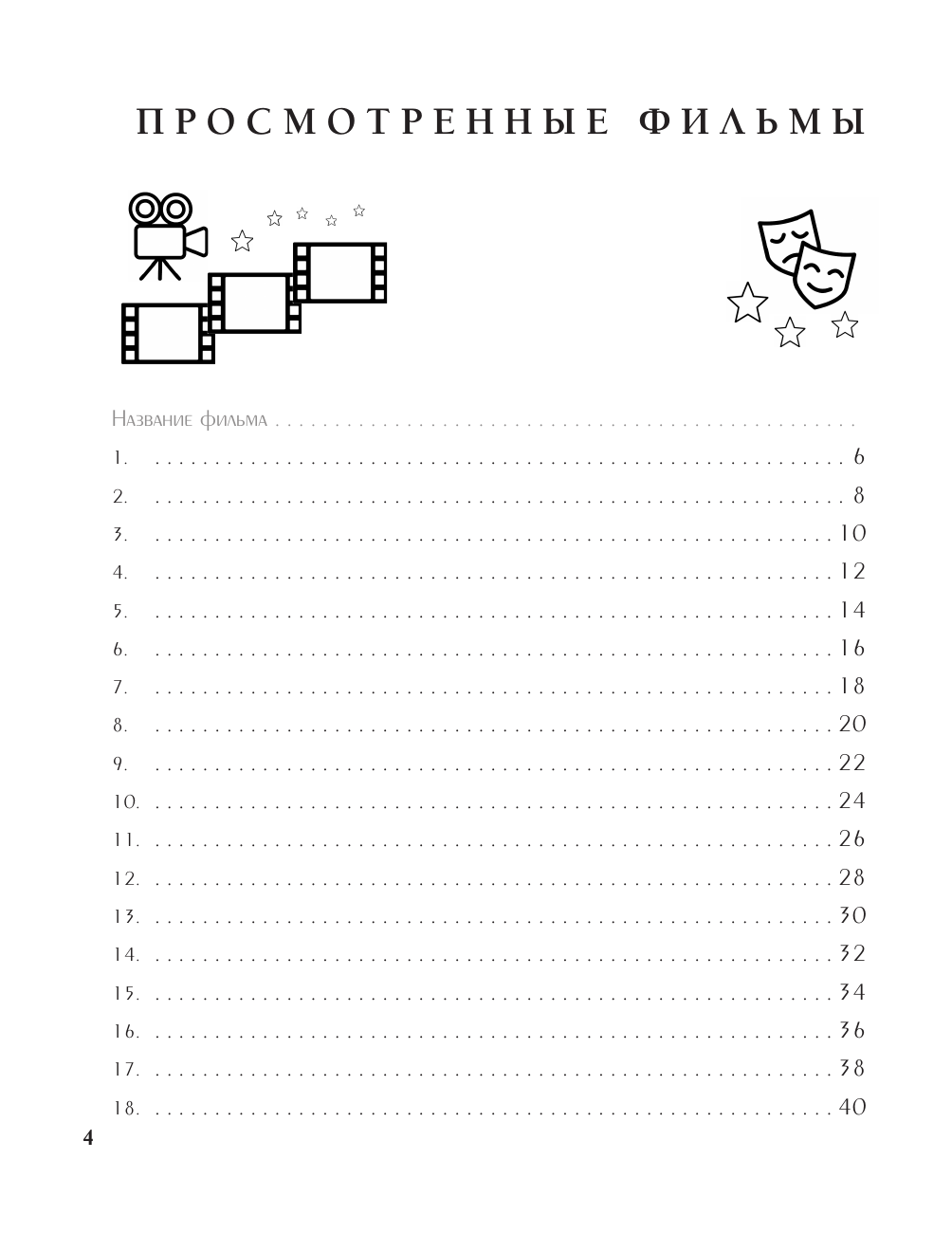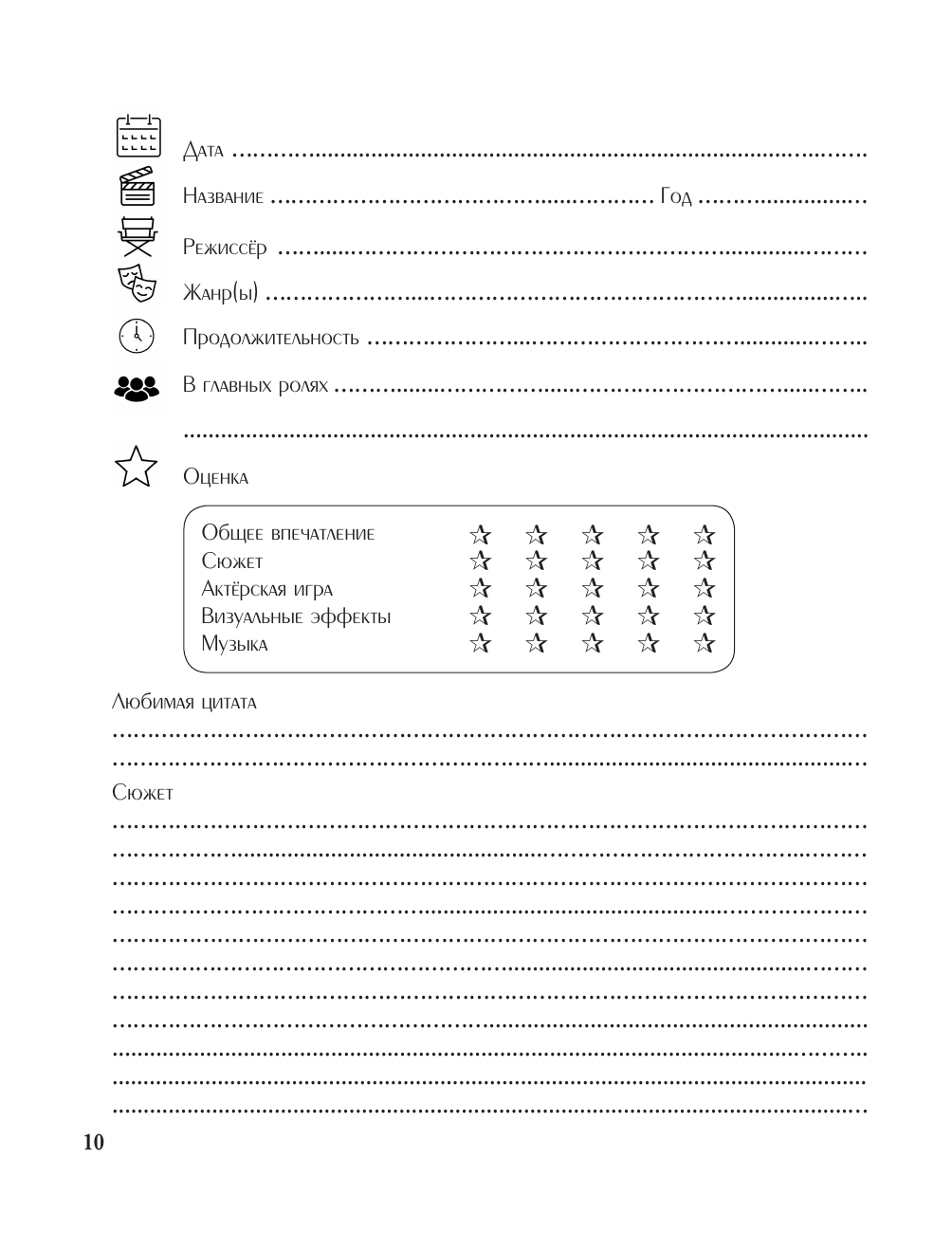 Этот дневник создан специально для тех, кто не просто любит кино, но и стремится смотреть фильмы осознанно, анализируя их художественные и философские аспекты. Записывайте свои мысли и эмоции от просмотренных картин, размышляйте над сюжетами, персонажами и режиссёрскими решениями. Дневник поможет вам углубить понимание кинематографа, отслеживать развитие собственного вкуса и осознавать, как фильмы влияют на ваше восприятие мира. Это ваше личное пространство для погружения в глубины киноискусства, позволяющее смотреть не только глазами, но и сердцем.
