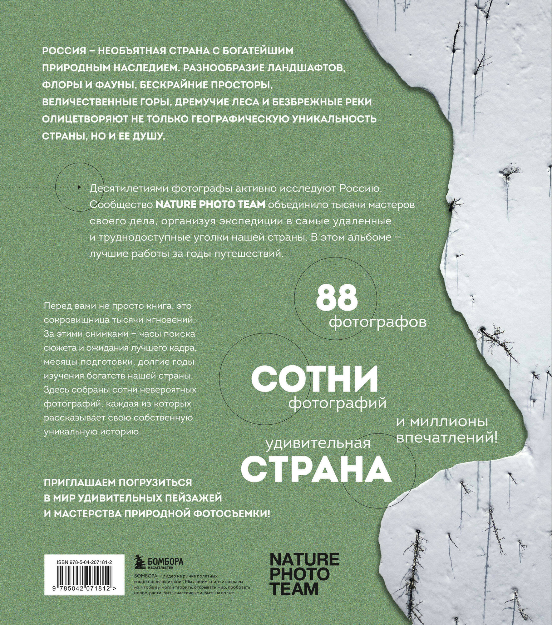 Природа нашей страны невероятно разнообразна: от живописных лесов Средней полосы до суровых просторов Ямала, от диких Курильских островов до загадочных Чарских песков. Каждый уголок России уникален и по-своему удивителен. В этом альбоме фотографы команды Nature Photo Team собрали бесценную мозаику снимков, чтобы показать, насколько контрастной может быть природа нашей страны, поделиться невероятными видами самых труднодоступных мест, а также обратить внимание читателя на необычные сюжеты, которые каждый может увидеть в своей повседневной жизни.