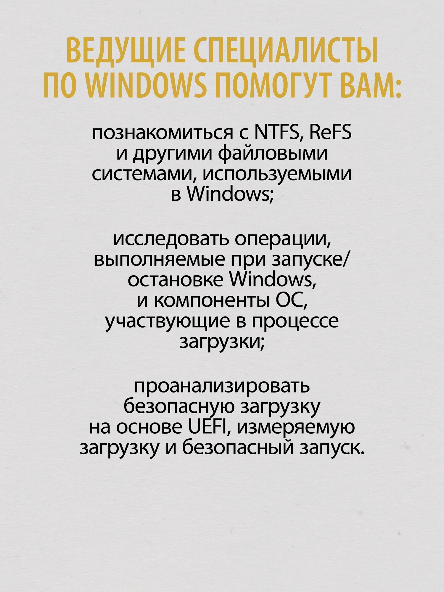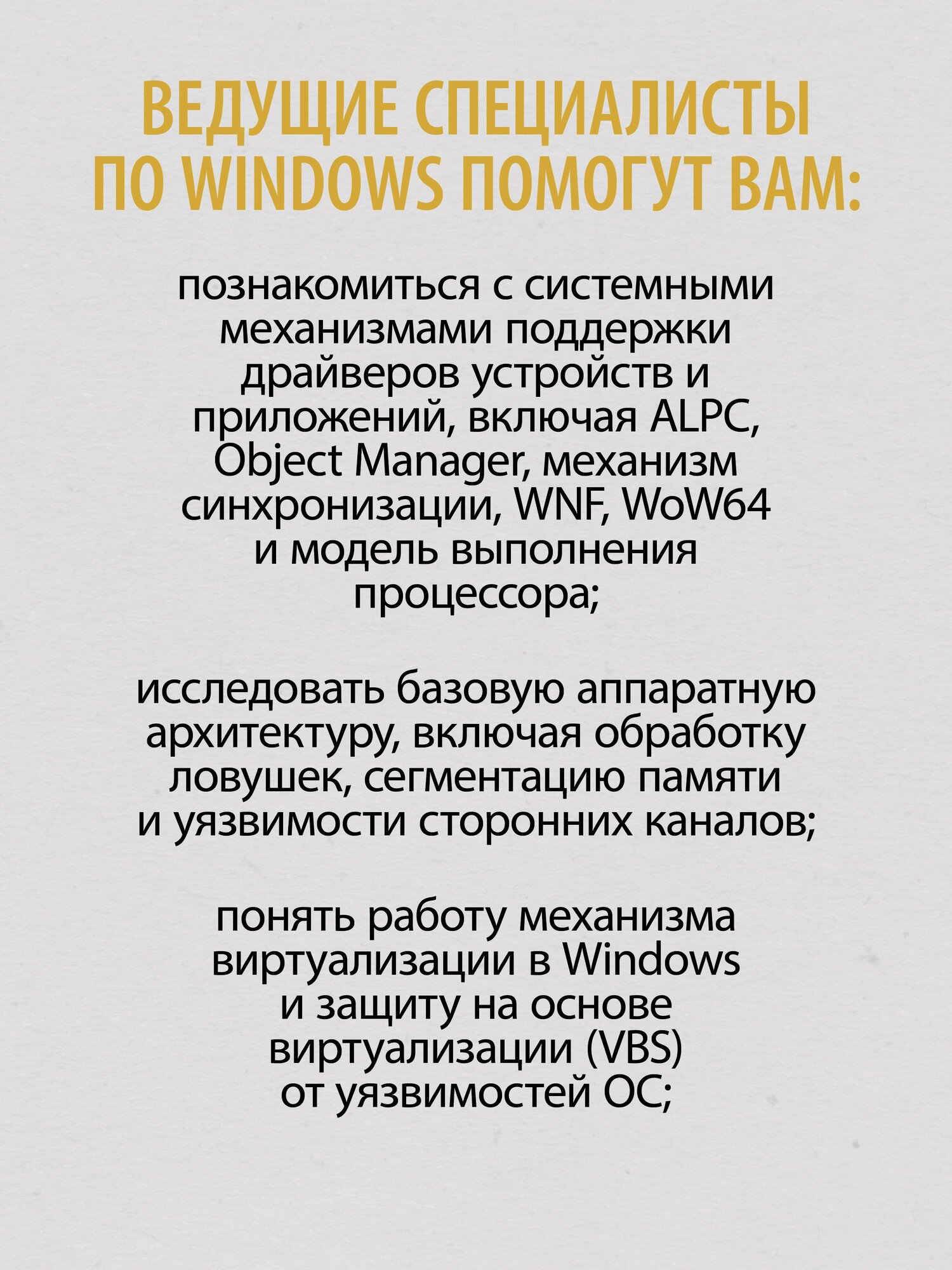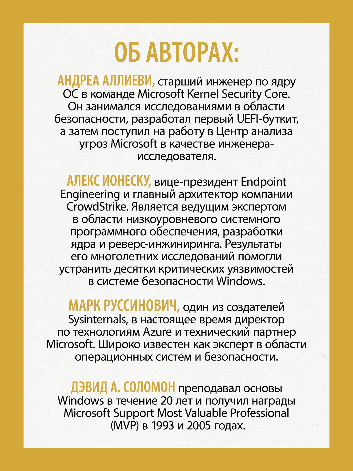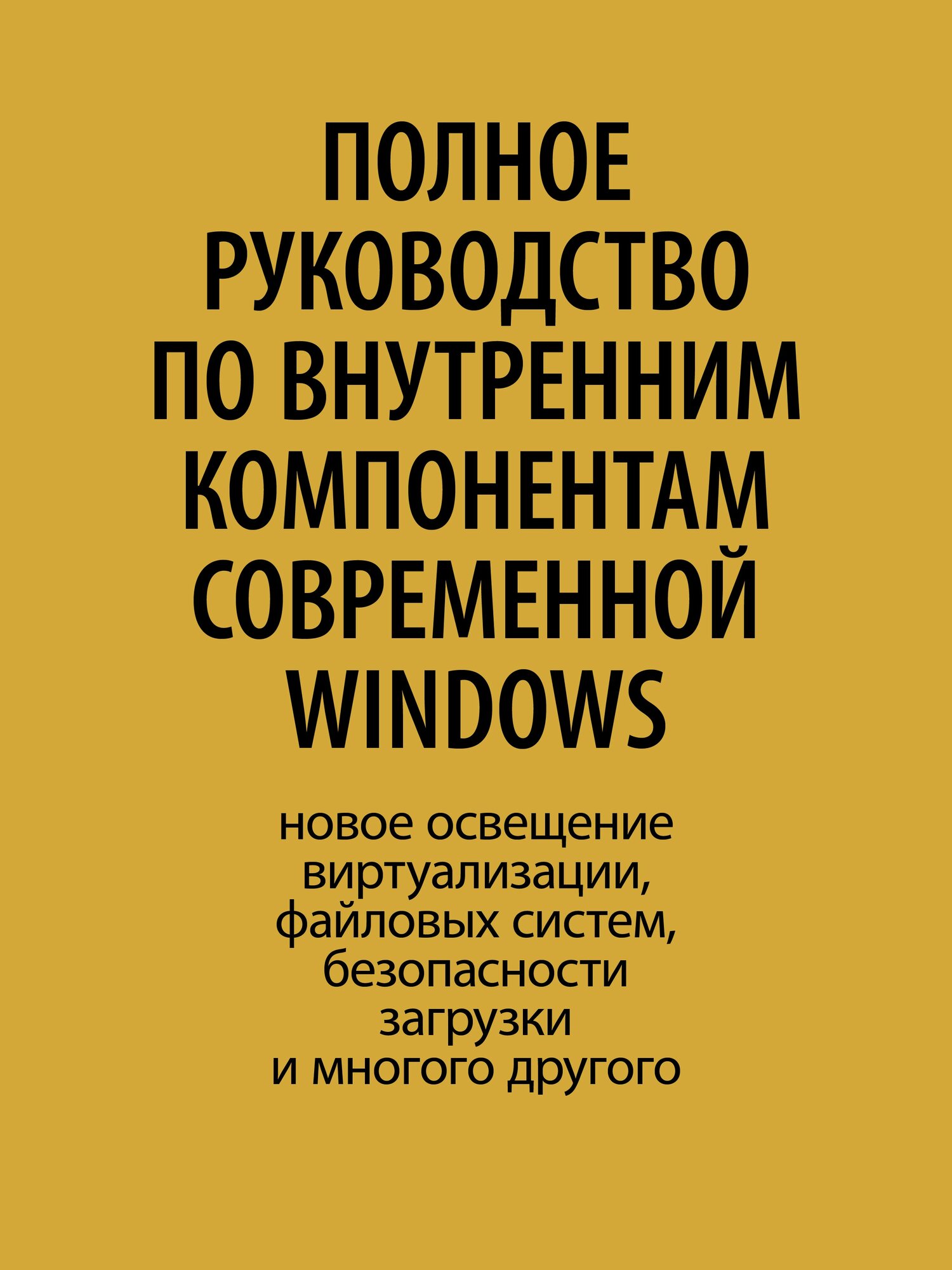 Зная, что находится у операционной системы «под капотом», системные администраторы смогут быстро разобраться с поведением системы и решать задачи повышения производительности и диагностики сбоев. Специалистам по безопасности пригодится информация о борьбе с уязвимостями операционной системы.Седьмое издание было полностью переработано под Windows 10/11 и Windows Server (2022, 2019 и 2016). Кроме этого в книгу были добавлены сведения по Hyper-V, полностью переработаны главы о процессе загрузки, новых технологиях хранения данных и механизмах управления Windows. Вы найдете уникальную информацию, основанную на исходном коде Microsoft, и практические эксперименты с применением новейших средств отладки, направленные на демонстрацию особенностей поведения внутренних компонентов Windows.Новые элементы дизайна пользовательского интерфейса, появившиеся в Windows 11, основаны на знакомых по Windows 10 технологиях, поэтому читатели смогут сразу перейти на новый этап развития компьютерных технологий.Для опытных программистов, архитекторов, администраторов и других специалистов по качеству, производительности, безопасности и сопровождению программного обеспечения.Необходимо знание Windows на уровне опытного пользователя.