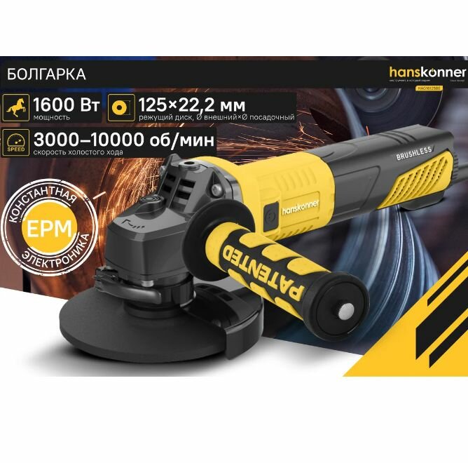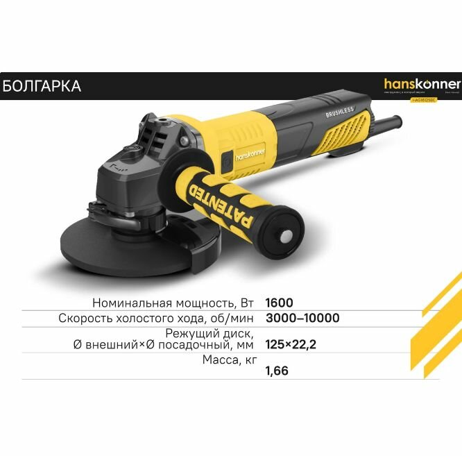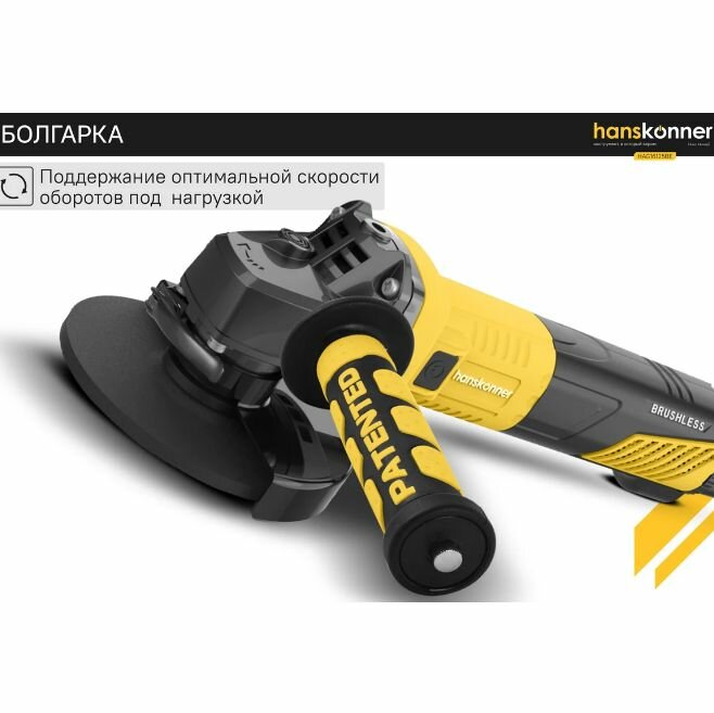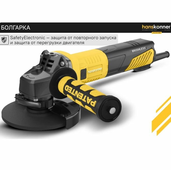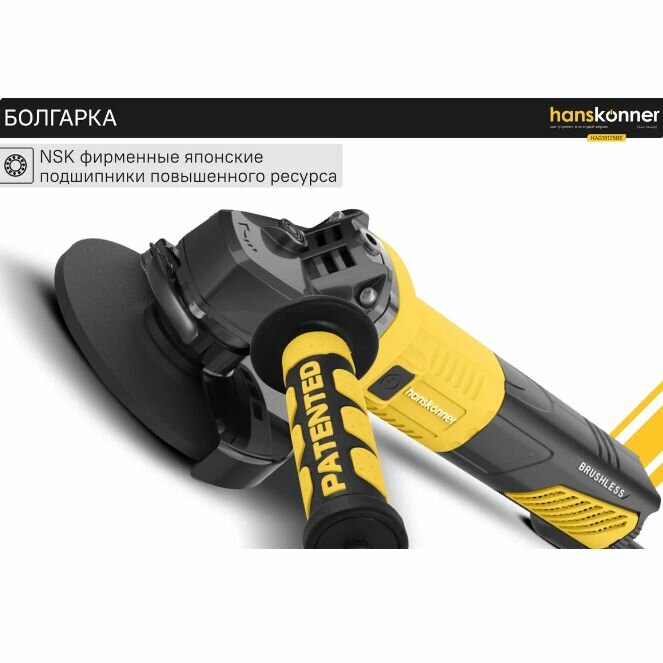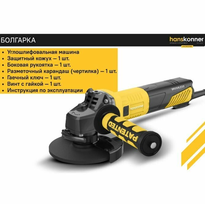Угловая шлифовальная машина Hanskonner HAG28230B — маневренный и мощный электроинструмент для шлифования и зачистки поверхностей, а также резки металлов, кирпича, керамики или камня без использования воды.Преимущества Данная модель имеет бесщеточный электродвигатель мощностью 2850 Вт и фирменные японские подшипники NSK, что повышает продуктивность и рабочий ресурс. Также, ресурс инструмента, подкреплен герметичным выключателем и функцией плавного пуска Продуктивность инструмента повышается поддержанием постоянства скорости вращения под рабочей нагрузкой Защитный кожух диска с мгновенной регулировкой положения, при помощи сопутного рычажка, дополняет легкость в обращении с ушм. Практичность модели подчеркнута виброгасящей боковой рукоятью. Безопасному ходу эксплуатации благоприятствует защита от повторного запуска Морозостойкий резиновый сетевой кабель длинной 5 м, позволяет охватит рабочую зону площадью 78 м2