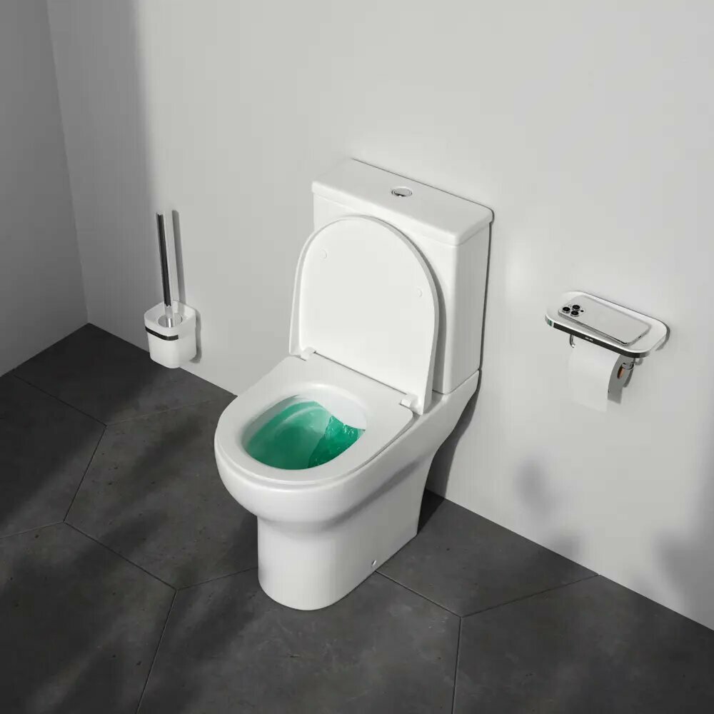 **Унитаз-компакт AM.PM Drive C9F8600LMSC** — это безободковый унитаз с двойным сливом. Чаша без ободка не накапливает грязь и бактерии, проста в уходе. Двойная система смыва дает возможность выбрать между полным и половинным сливом воды, что позволяет экономить воду. Антибактериальное покрытие обеспечивает надежную защиту от размножения бактерий на поверхности унитаза. Система антивсплеск предотвращает разбрызгивание воды при смыве, что поддерживает чистоту в туалете. Этот унитаз изготовлен из санфарфора, имеет овальную форму чаши и дюропластовое белое, квадратное сиденье.