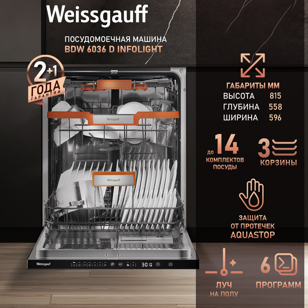 На сегодняшний день товар «Встраиваемая посудомоечная машина Weissgauff BDW 6036 D Infolight 59.6 см 6 программ цвет нержавеющая сталь» можно купить с кешбеком в 1 магазине: Яндекс.Маркет