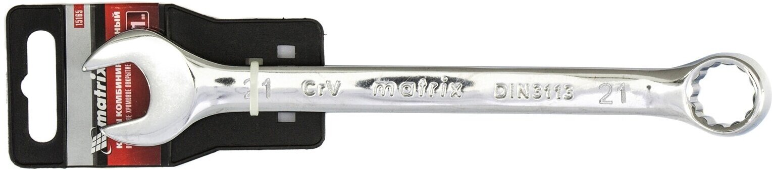Комбинированный ключ Matrix 15165 размером 21 мм, из стали CrV, с покрытием «полированный хром», пригодится во время ремонтных работ дома или в гараже. С его помощью можно быстро монтировать и демонтировать крепежные элементы. Угол наклона кольцевого зева относительно плоскости инструмента составляет 15°, поэтому ключом удобно работать в труднодоступных местах.ПреимуществаВысокая деформационная стойкость — ключ изготовлен из хромованадиевой стали, а рабочая часть закалена до твердости 45 HRC.Защита от разрушения — полированное хромовое покрытие предотвращает образование коррозии.Аккуратная работа — накидные части с 12-гранным профилем охватывают всю поверхность крепежа, уменьшая риск деформации его граней.