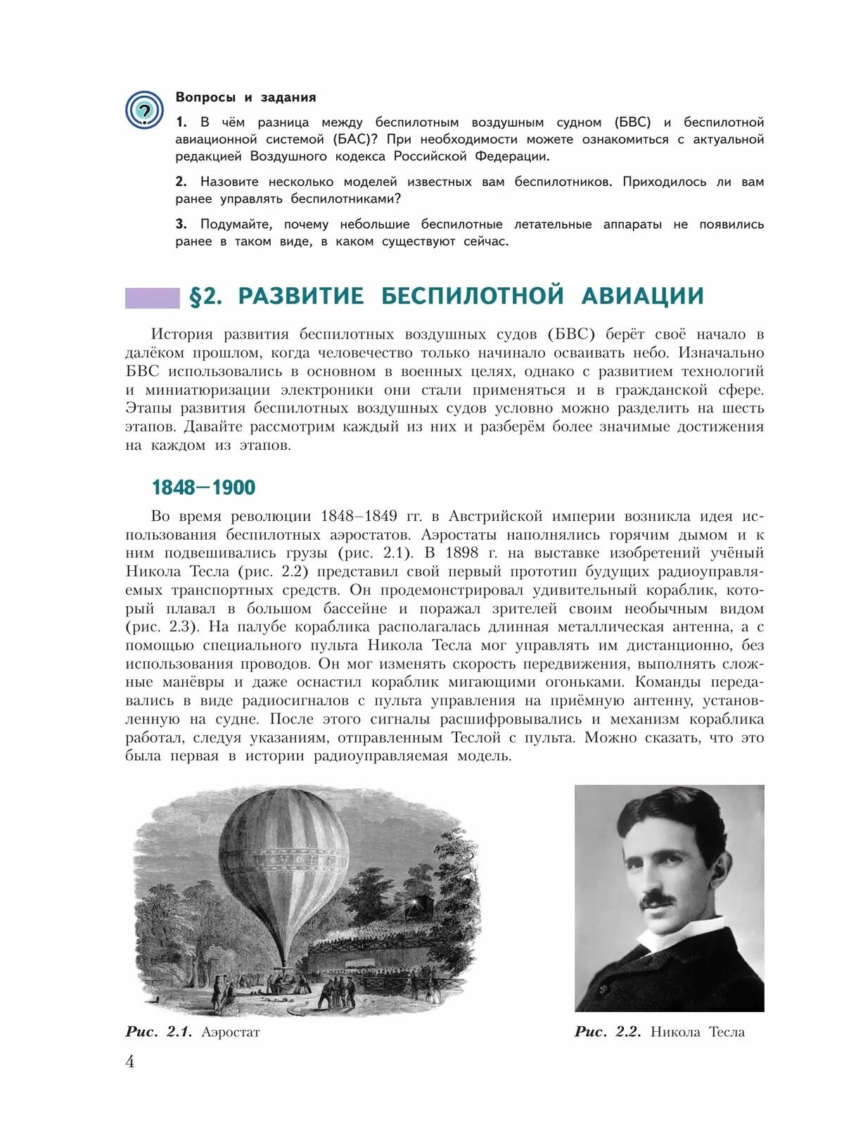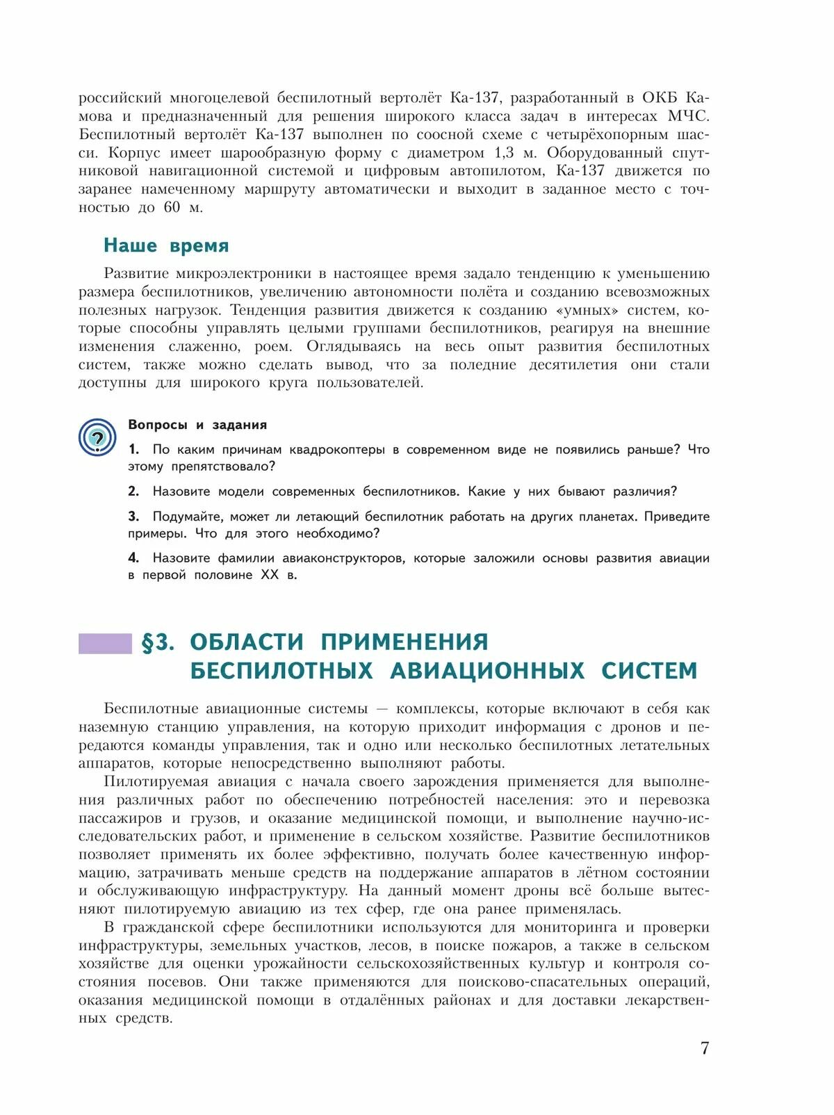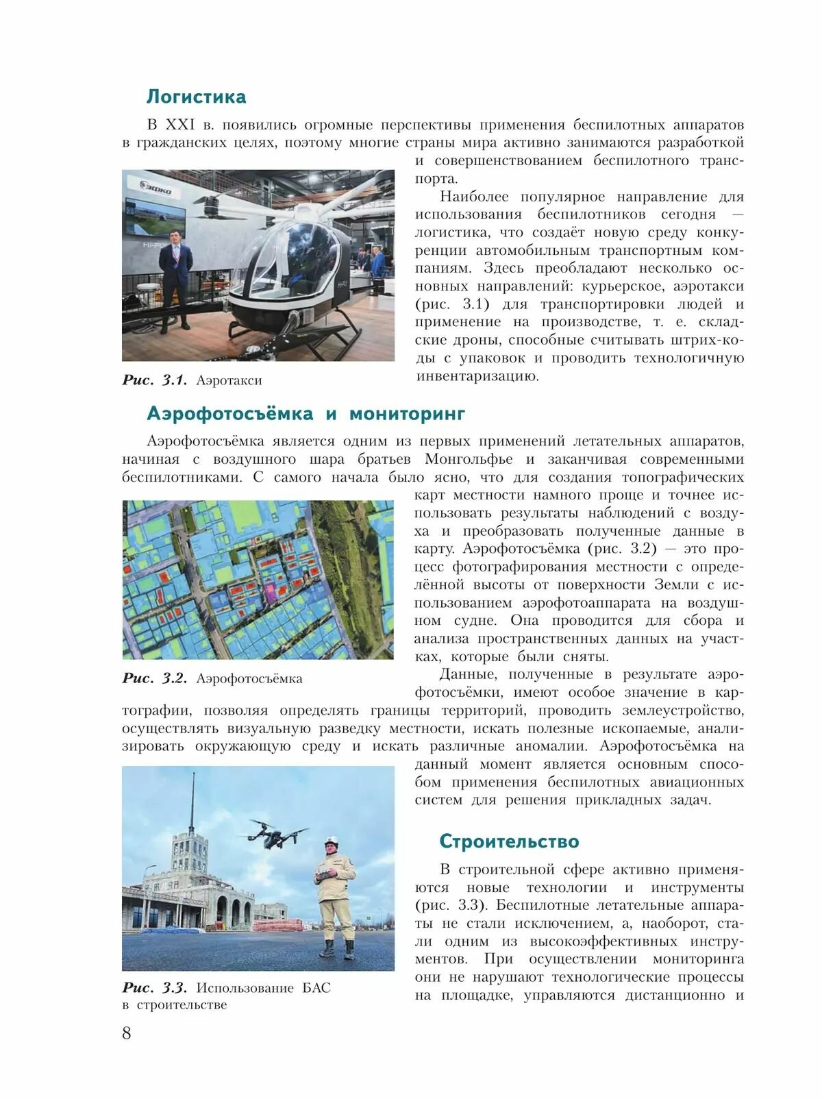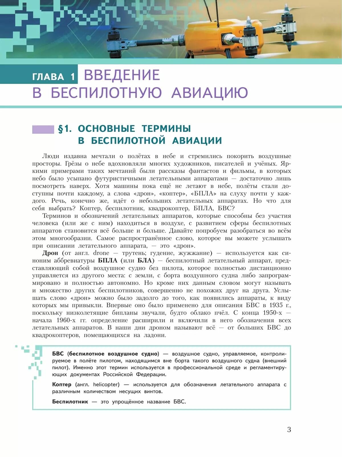 Вариативный модуль предмета «Труд (технология)» для 8–9 классов. Представляет информацию о развитии беспилотной авиации в России, о принципах работы, классификации, функциях и назначении беспилотных летательных аппаратов. В издании последовательно представлены основы программирования беспилотников на языке Python. В учебный курс заложено изучение основных элементов конструкции (на примере квадрокоптеров), принципов работы моторов, систем связи, основ ручного пилотирования. Акцентировано внимание на изучение новых инженерных профессий, расширение представления об областях применения и направлениях развития беспилотной авиации.