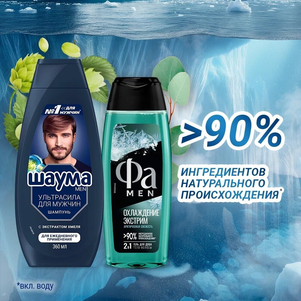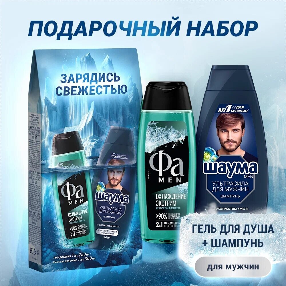 Состав набора:1. Шампунь Шаума Men Ultra Сила, 360 мл.2. Гель для душа Фа Men Охлаждение Экстрим, 250 мл.Шаума мужской шампунь Ultra Сила для всех типов волос. Укрепляет волосы, придает волосам силу и здоровый вид. Веган формула* с экстрактом хмеля без силиконов и парабенов. Для ежедневного применения. *Не содержит ингредиентов животного происхождения.Пробуди свою внутреннюю силу вместе с освежающим ароматом эвкалипта. Мужской гель для душа Фа обеспечивает эффективный уход за телом, очищает твое тело и волосы, способствует защите кожи от пересушивания. Разработано специально для мужчин. - арктическая свежесть;- >90 % ингредиентов натурального происхождения*;- 2-в-1 гель для душа тело-волосы;- веган формула: не содержит ингредиентов животного происхождения.*вкл. воду.