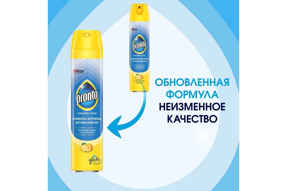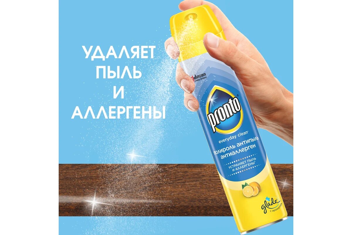 Аэрозоль Pronto Антиаллерген — это полироль для ухода за мебелью, которое помогает поддерживать чистоту в жилых помещениях и защищает поверхность от пыли и других загрязнений. Оно нейтрализует аллергены и мелкую пыль, а также придаёт блеск и предотвращает появление царапин и потёртостей. Кроме того, средство эффективно удаляет отпечатки пальцев и другие жирные загрязнения. После использования оставляет приятный цитрусовый аромат.