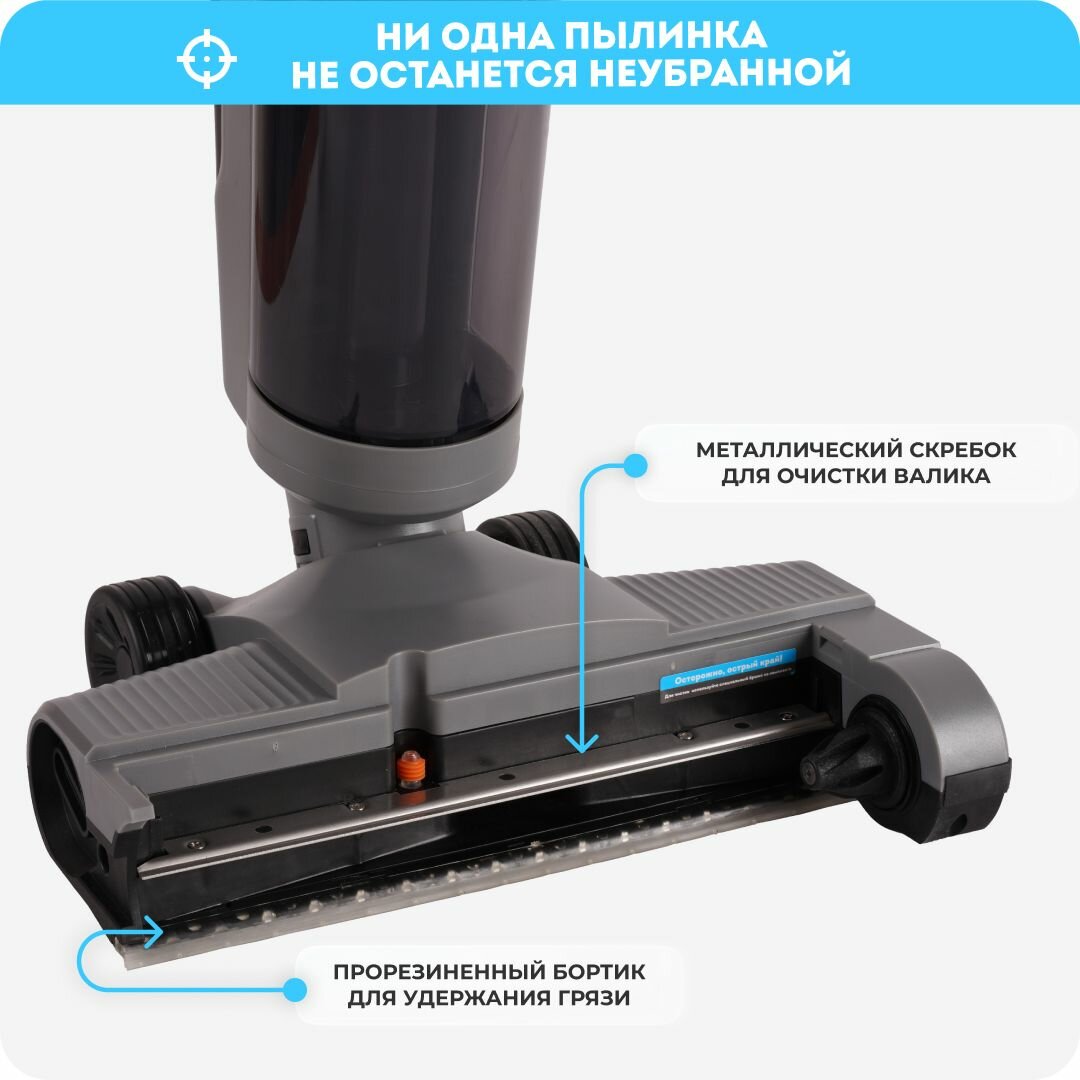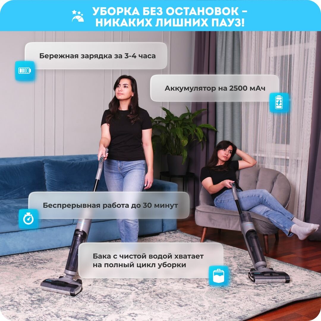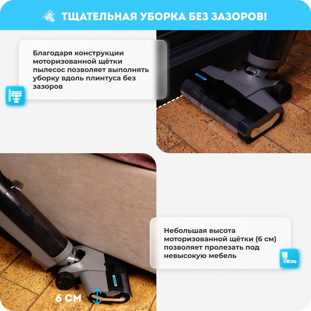 - сухая и влажная уборка (2 режима) - Бесщёточный инверторный мотор 150 Вт, 86 000 об/мин - моторизованная щётка 480 об/мин - функция следования - облегчает вес и ускоряет работу с пыликом. Юркий и манёвренный. - простое управление двумя кнопками - аккумулятор 2500 мач, 25.2В, 63 Вт*ч, до 30 мин работы - голосовой ассистент - подскажет, когда пора налить чистую воду, слить грязную или поставить на зарядку - удобная ручка (удобнее чем кольцо), не надо удерживать никаких кнопок - умная пауза при парковке и продолжение работы при снятии - 3-этапная очистка воздуха: плстиковая решётка → мелкая сетка → губчатый фильтр - можно доливать воду в бак, не снимая его - датчик заполнения бака с грязной водой - прилегает вплотную к стене - спереди и справа валик чистит почти впритык к плинтусу, не оставляя неубранных зазоров - хороший валик: шире чем у многих других, благодаря длинному мягкому ворсу - распределяет воду без пропусков на поверхности - расходует немного воды, не оставляет лужи на полу - удобное снятие валика - функция самоочистки (2 мин), но не на 100% работает - чистит больше именно валик, и то лишь частично - двойная коробка: надёжная транспортировочная + красивая подарочная