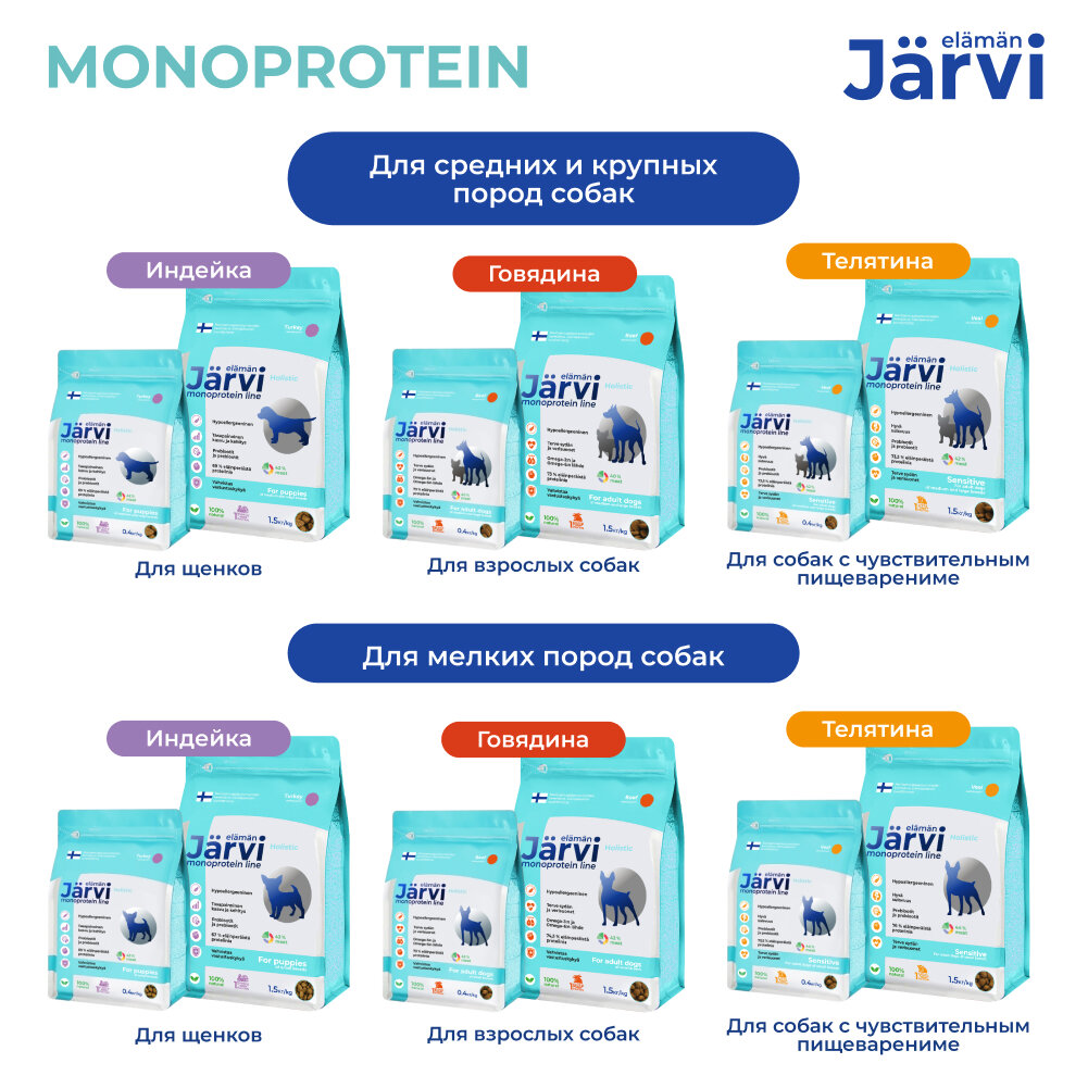 Сухой корм Jarvi Monoprotein Line – это холистический, гипоаллергенный, полнорационный корм для сбалансированного питания. Он соответствует высоким стандартам финского качества, разработан нутрициологами и одобрен ветеринарами.В составе корма используется только один источник животного белка, что делает его подходящим для питомцев, предрасположенных к пищевой непереносимости, повышенной чувствительности кишечника и кожи. В Jarvi Monoprotein Line содержится от 63 до 82% животного белка, что делает корм идеальным для ежедневного потребления и удовлетворения всех потребностей вашего питомца.Кроме того, содержание всех необходимых витаминов и микроэлементов способствует полноценному развитию, поддержке здоровой кожи и шерсти, укреплению опорно-двигательного аппарата и сердечно-сосудистой системы вашего питомца. Естественные источники FOS, MOS, пробиотический и пребиотический комплекс обеспечивают здоровую микрофлору кишечника и, следовательно, хорошее пищеварение. Смесь натуральных трав (экстракт эхинацеи, расторопша, розмарин) обладает антиоксидантным свойством, поддерживая иммунитет питомца и повышая сопротивляемость организма к различным заболеваниям.Широкий ассортимент Jarvi Monoprotein Line позволит вам подобрать корм, подходящий под индивидуальные особенности вашего домашнего животного.