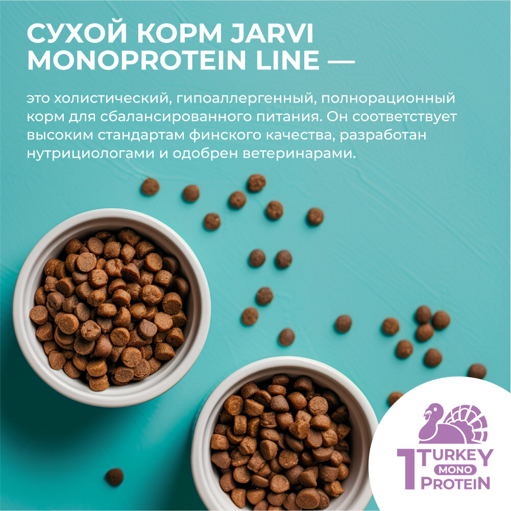 Сухой корм Jarvi Monoprotein Line – это холистический, гипоаллергенный, полнорационный корм для сбалансированного питания. Он соответствует высоким стандартам финского качества, разработан нутрициологами и одобрен ветеринарами.В составе корма используется только один источник животного белка, что делает его подходящим для питомцев, предрасположенных к пищевой непереносимости, повышенной чувствительности кишечника и кожи. В Jarvi Monoprotein Line содержится от 63 до 82% животного белка, что делает корм идеальным для ежедневного потребления и удовлетворения всех потребностей вашего питомца.Кроме того, содержание всех необходимых витаминов и микроэлементов способствует полноценному развитию, поддержке здоровой кожи и шерсти, укреплению опорно-двигательного аппарата и сердечно-сосудистой системы вашего питомца. Естественные источники FOS, MOS, пробиотический и пребиотический комплекс обеспечивают здоровую микрофлору кишечника и, следовательно, хорошее пищеварение. Смесь натуральных трав (экстракт эхинацеи, расторопша, розмарин) обладает антиоксидантным свойством, поддерживая иммунитет питомца и повышая сопротивляемость организма к различным заболеваниям.Широкий ассортимент Jarvi Monoprotein Line позволит вам подобрать корм, подходящий под индивидуальные особенности вашего домашнего животного.