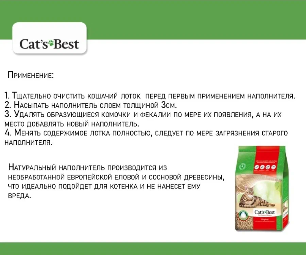 Древенсый (растительный) комкующийся наполнитель для кошачьего туалета Cat's Best Original изготовлен из 100 % экологический чистых растительных волокон. Основной наполнитель можно использовать 4-6 недель. Прекрасно связывает запахи и впитывает жидкость: впитываемость – более 700% жидкости! Наполнитель можно использовать в качестве компоста, 100% биологический распад. Образовавшиеся комочки можно выбрасывать в обычный туалет.