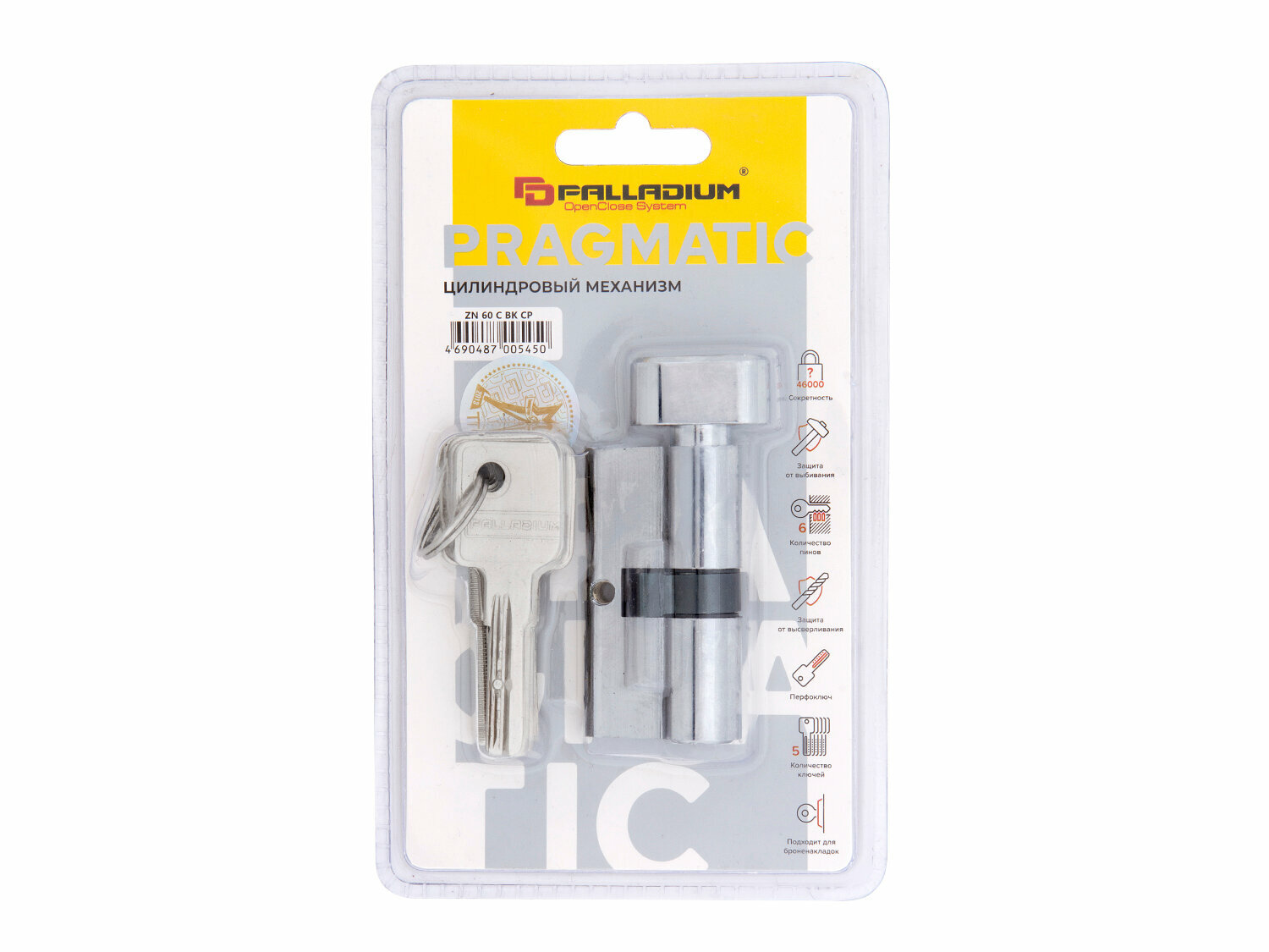 **Цилиндр Palladium BK CP** с механизмом «ключ-вертушка» предназначен для входных дверей межкомнатных полотен, требующих запирания с обеих сторон. Устанавливается во врезные замки с отверстием под евроцилиндр. Монтаж не должен проходить с усилием. Бородок в исходном положении выступает за корпус цилиндра. Его вставляют поворотом ключа, после чего приступают к установке.