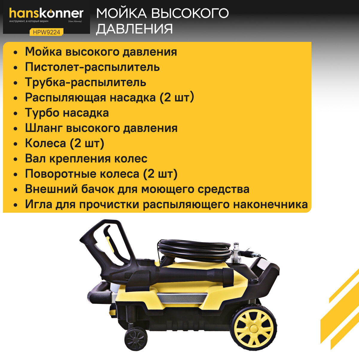 Мойка высокого давления Hanskonner HPW9231I, асинхронный мотор, 3200Вт, 215 бар, ШВД-10м предназначена для мойки транспортных средств, очистки загрязненных поверхностей при помощи чистой воды под высоким давлением в бытовых условиях.Преимущества Асинхронный двигатель - низкий уровень шума и увеличенный ресурс работы Увеличенный до 10м эластичный шланг высокого давления на барабане позволяет свободно мыть автомобиль, чистить крыши дачных построек и другие объекты не передвигая мойку, благодаря своей эластичности шланг легко разматывается и сматывается на барабан Пеногенератор объемом 1 литр в комплекте обеспечит качественное нанесение густой пены Дополнительная роторная фреза TurboNozzle в комплекте для работы с сильными загрязнениями