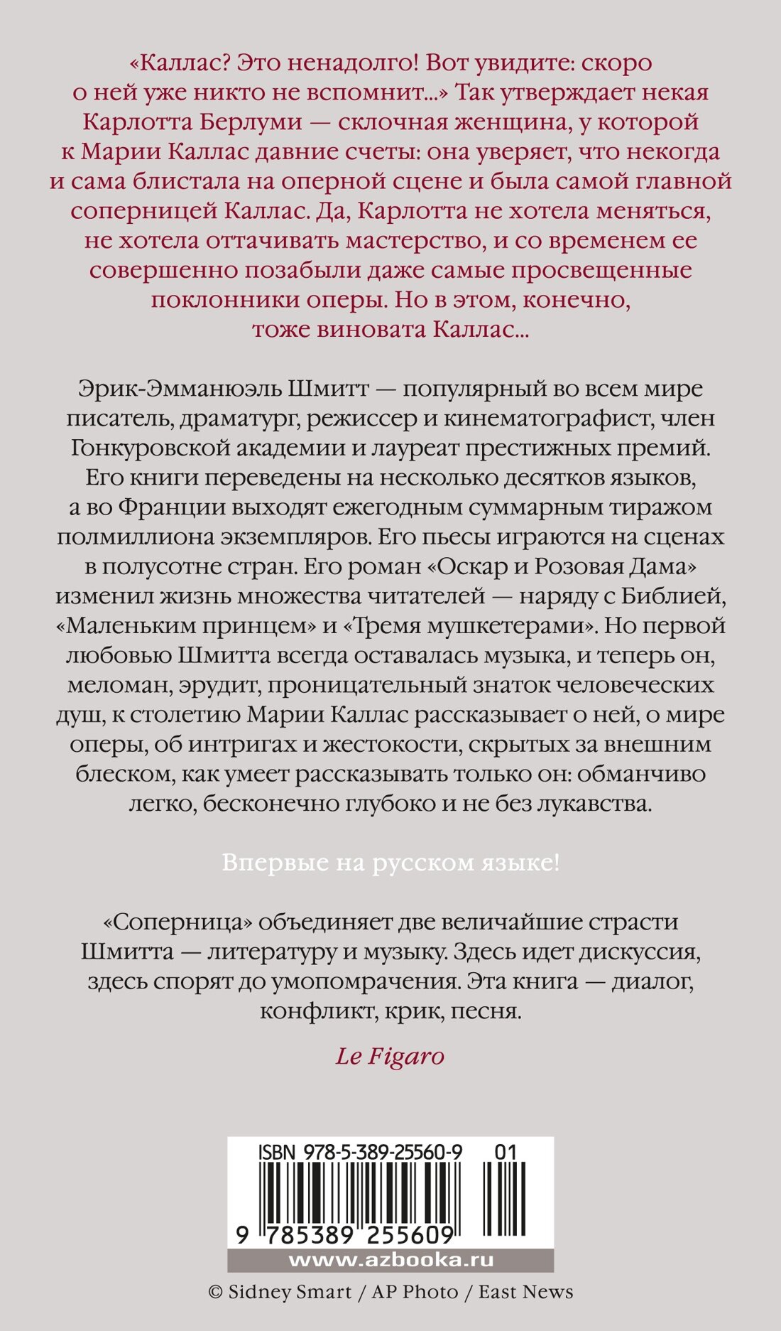 «Каллас? Это ненадолго! Вот увидите: скоро о ней уже никто не вспомнит » Так утверждает некая Карлотта Берлуми — склочная женщина, у которой к Марии Каллас давние счеты: она уверяет, что некогда и сама блистала на оперной сцене и была самой главной соперницей Каллас. Да, Карлотта вела себя как капризная примадонна, не хотела учиться, не хотела меняться, не хотела оттачивать мастерство, и со временем ее совершенно позабыли даже самые просвещенные поклонники оперы. Но в этом, конечно, тоже виновата Каллас Эрик-Эмманюэль Шмитт — популярный во всем мире писатель, драматург, режиссер и кинематографист, член Гонкуровской академии и лауреат престижных премий. Его книги переведены на несколько десятков языков, а во Франции выходят ежегодным суммарным тиражом полмиллиона экземпляров, его пьесы играются на сцене в полусотне стран. Его роман «Оскар и Розовая Дама» изменил жизнь множества читателей — наряду с Библией, «Маленьким принцем» и «Тремя мушкетерами». Но первой любовью Шмитта всегда оставалась музыка — в юности он мечтал стать композитором, — и теперь он, меломан, эрудит, проницательный знаток человеческих душ, рассказывает историю Марии Каллас, чье столетие со дня рождения мир отметил в 2023 году. Каллас — величайшая оперная звезда, всю свою жизнь посвятившая искусству, которое в итоге ее и погубило. Каллас — легенда, ставшая мифом (в 2024 году аудитория крупнейших мировых кинофестивалей рукоплескала «Марии», байопику, поставленному Пабло Ларраином с Анджелиной Джоли в заглавной роли). Однако «Соперница» — совсем другая история: миф наизнанку, взгляд из зазеркалья, антипортрет глазами женщины, которая Марию Каллас ненавидит, и эту историю о ней, о мире оперы, об интригах и жестокости, скрытых за внешним блеском, Шмитт рассказывает, как умеет только он: обманчиво легко, бесконечно глубоко и не без лукавства. Впервые на русском!