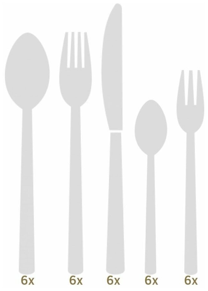 | Комплектация (для интернет-магазина) | Ложка столовая - 6шт; вилка столовая - 6шт; нож столовый - 6шт; ложка десертная - 6шт; вилка десертная - 6шт |