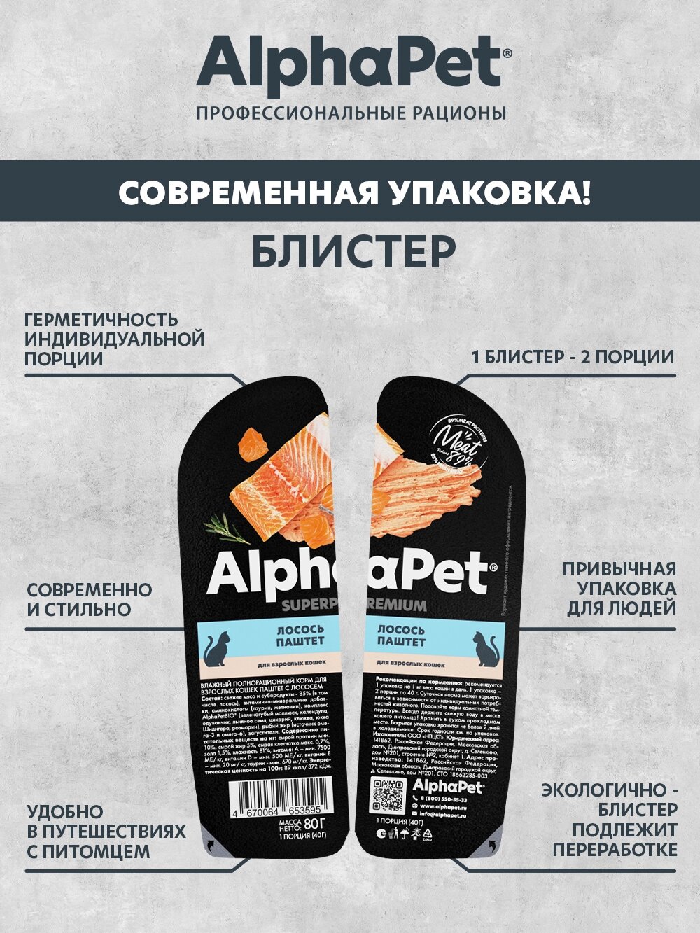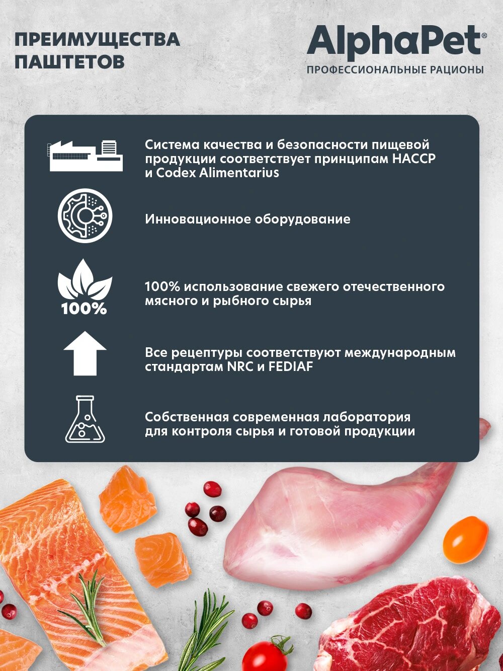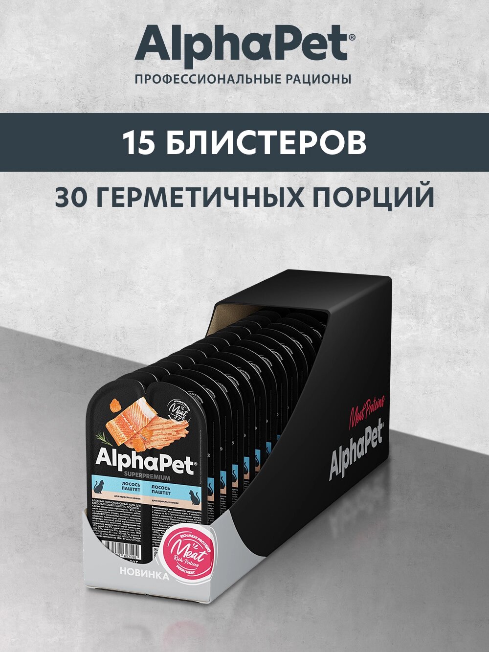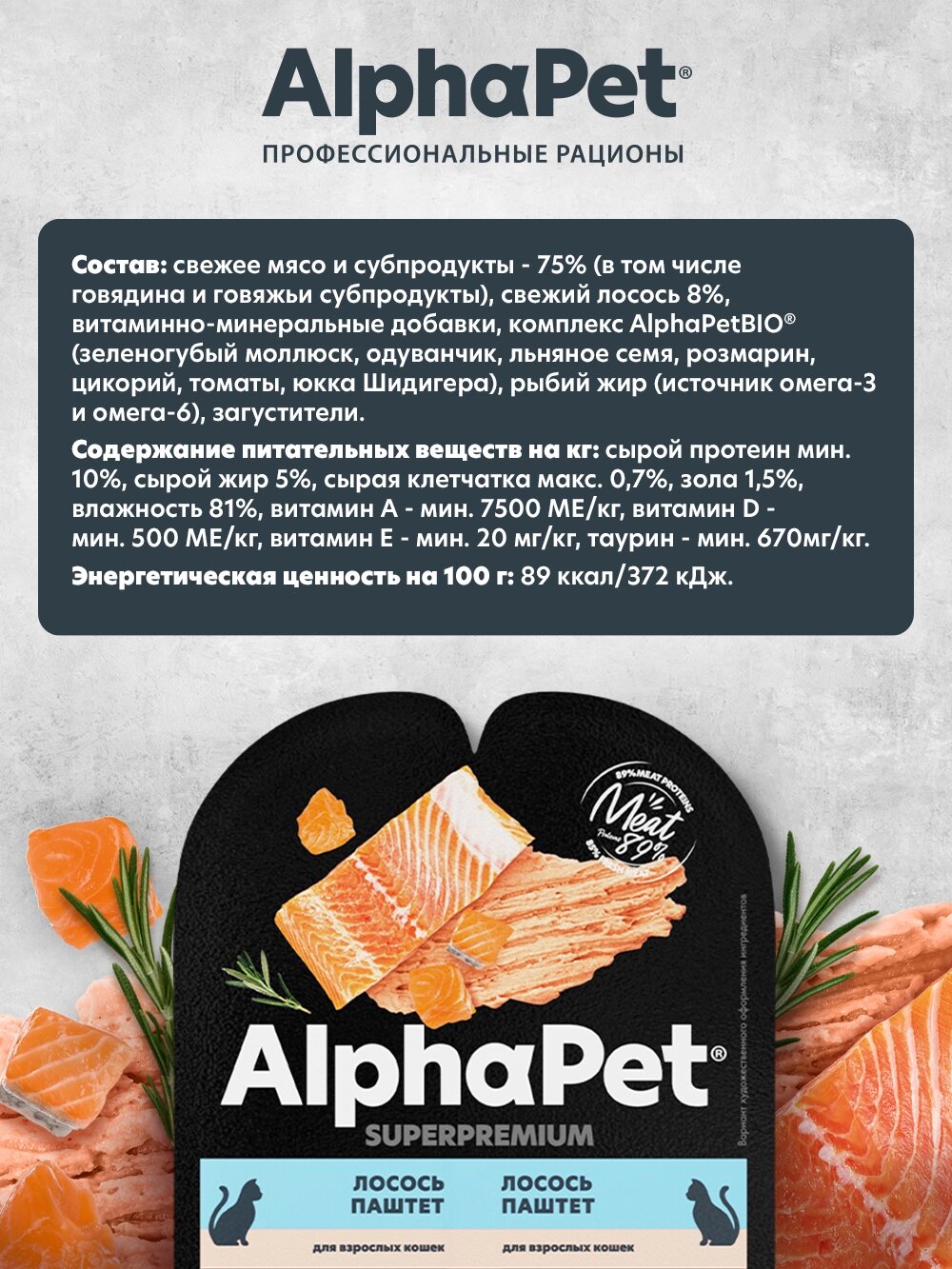 Здоровый и активный питомец – главная задача каждого хозяина. Команда AlphaPet создает и производит полезные корма высшей категории качества Holistiс, давая возможность каждому владельцу быть уверенным в правильном выборе кормления для своего животного. AlphaPet SUPERPREMIUM - супер-премиальное питание на основе натуральных ингредиентов. Линейка питания для животных, владельцы которых хотят быть уверены в лучшем выборе корма для своего питомца. Максимально открытый и понятный состав продукта, приготовленного по инновационной технологии из свежего мяса и с содержанием большого количества мясного белка!Пашеты AlphaPet:Из свежего мяса;Беззерновая рецептура;Ингредиенты качества human grade;Уникальный комплекс AlphaPetBio;Вкусовая привлекательность и поедаемость проверены в собственно центре AlphaPet.*Не содержит ГМО искусственных красителей, ароматизаторов, консервантов, кукурузу, пшеницу и добавленный глютен.