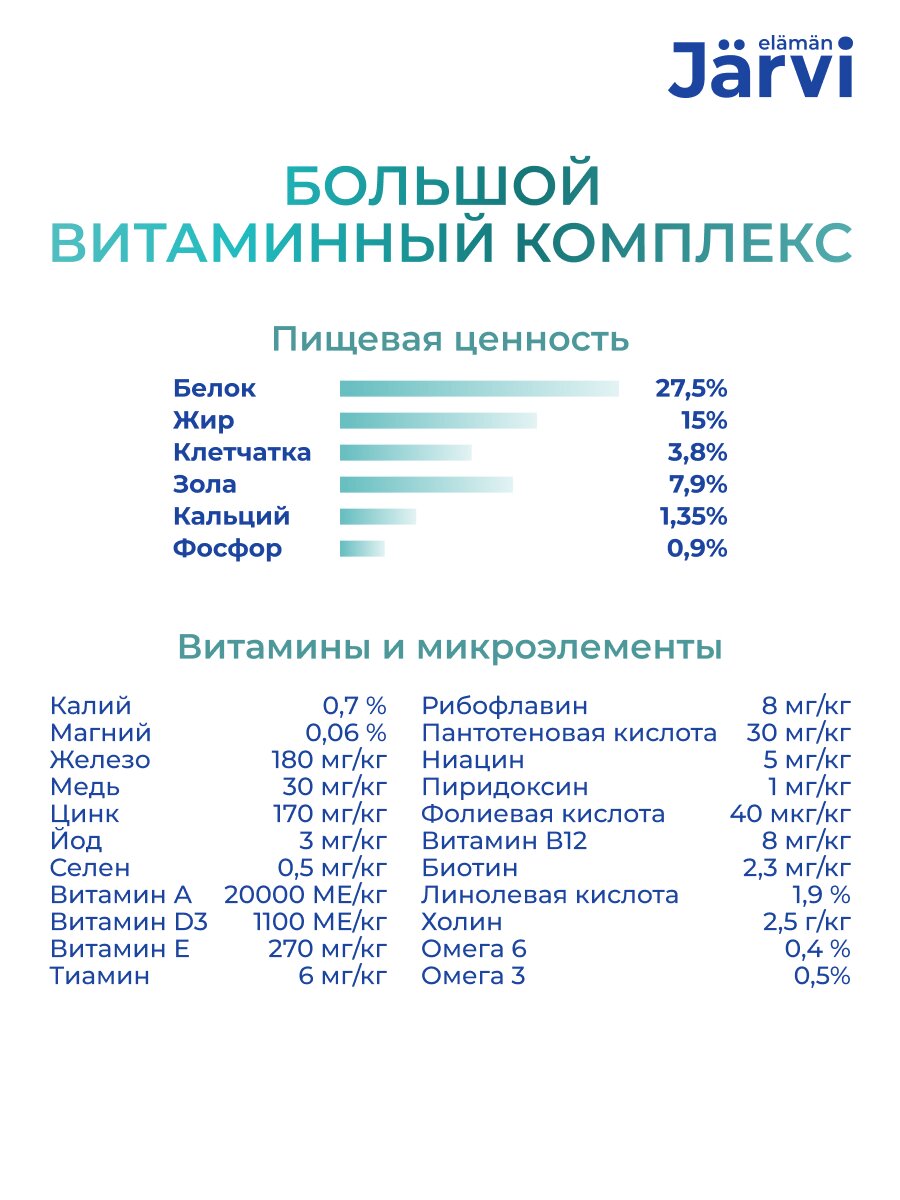 Jarvi монопротеиновый сухой корм для собак это сбалансированный рацион, специально разработанный для собак средних и крупных пород с чувствительным пищеварением.Особенности корма для собак Ярви:1. Телятина (30%) единственный источник животного белка в составе корма сухого для собак. Монопротеиновый корм снижает риск возникновения аллергии и уменьшает нагрузку на пищеварение. 2. Цельнозерновой рис и ячмень легкоусвояемые углеводы, которые способствуют здоровому пищеварению и обеспечивают энергию для активной жизни питомца. 3. Жом свеклы содержит диетические волокна, которые улучшают перистальтику кишечника и поддерживают баланс микрофлоры.4. Натуральные источники инулина (пребиотик) способствуют росту полезных бактерий в кишечнике и усвоению питательных веществ. 5. Хондроитин и глюкозамин поддерживают функциональность суставов, укрепляют хрящевую ткань, что особенно важно для собак средних и крупных пород.6. Jarvi гипоаллергенный корм для собак не содержит искусственных красителей, ароматизаторов или консервантов.Польза:- Поддержание здорового пищеварения- Снижение риска пищевой аллергии- Витаминно-минеральный комплекс для иммунной системы- Гибкие и подвижные суставы и хрящиРазнообразьте рацион питомца влажными кормами и лакомствами Jarvi это будет стимулировать его аппетит и послужит дополнительным источником влаги, витаминов и минералов.Разнообразьте рацион питомца влажными кормами и лакомствами Jarvi это будет стимулировать его аппетит и послужит дополнительным источником влаги, витаминов и минералов.