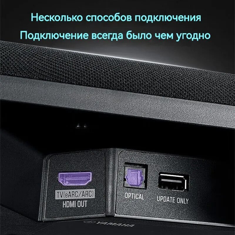 Саундбар Yamaha представляет собой простой и эффективный способ значительно повысить качество звука современного ТВ. Саундбар очень прост в размещении и благодаря небольшой высоте корпуса его можно установить непосредственно перед ТВ на стойке или подвесить на стену. Так как Yamaha имеет встроенный сабвуфер, вся система получится максимально лаконичной и простой в использовании. Корпус саундбара имеет приятную обтекаемую форму со скругленными углами и защитной сеткой, закрывающей всю фронтальную панель. Органы управления основными функциями и индикаторы сгруппированы в блоке в середине верхней части Yamaha . В колонке используется двухполосная встроенная стереоакустика (по одну твитеру и басовику в каждом канале), а также два отдельных НЧ-динамика в качестве сабвуфера. Для дополнительного повышения отдачи на низких частотах в саундбаре предусмотрены фазоинверторы. Все это обеспечивает Yamaha мощное и насыщенное звучание даже без использования внешнего сабвуфера. А для дополнительного усиления низкочастотного диапазона можно использовать специальный DSP-режим Bass Extension. Мощность встроенных усилителей Yamaha составляет 120 Вт (по 30 Вт на каждый стереоканал и 60 Вт на сабвуфер). Для подключения к ТВ в саундбаре предусмотрен HDMI-вход с поддержкой возвратного аудиоканала ARC. Таким образом, звук со всех источников сигала, подсоединенных к телевизору, можно будет транслировать на Yamaha . Кроме того, данная модель имеет оптический вход, что значительно повышает гибкость ее использования. Саундбар оснащен декодерами Dolby Digital и Dolby Atmos с возможностью получения виртуального окружающего звука, а также DSP с несколькими режимами работы. Отдельно стоит отметить функцию Voice Clear, которая значительно повышает разборчивость передачи диалогов. Yamaha оснащен Bluetooth, с помощью которого можно не только транслировать на колонку сигнал с совместимых мобильных устройств, но и управлять ее работой через фирменное приложение.