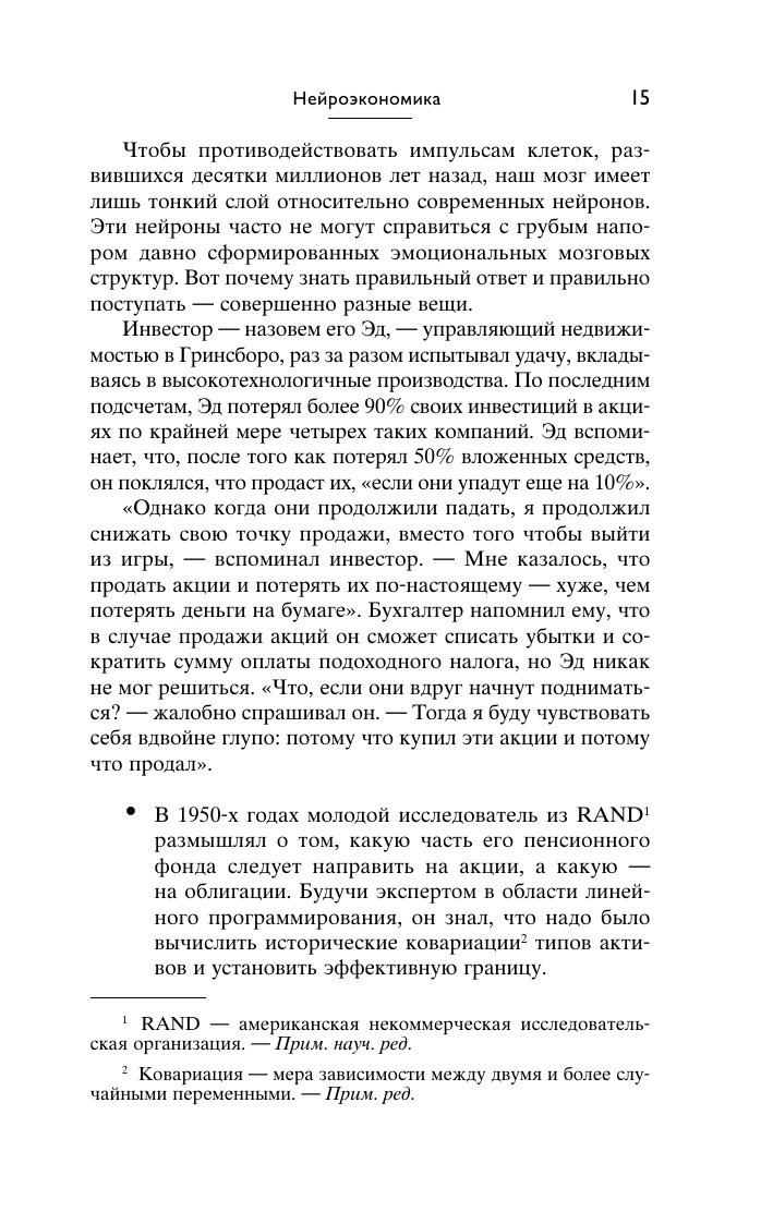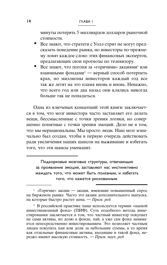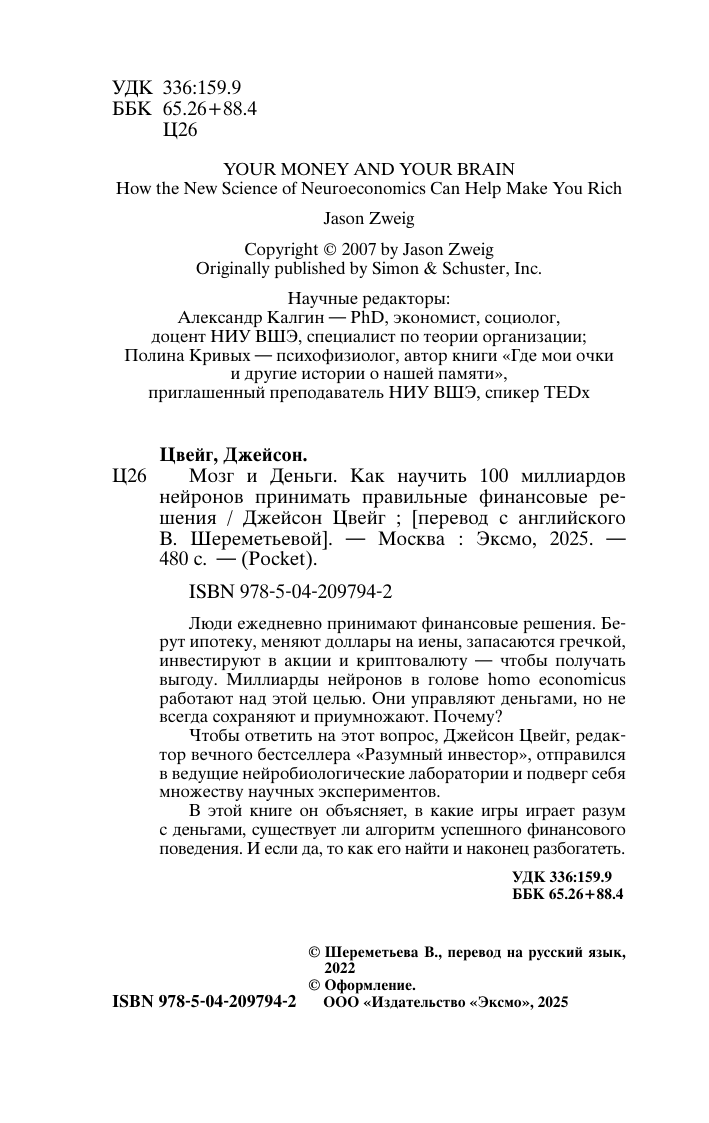 Люди ежедневно принимают финансовые решения. Берут ипотеку, меняют доллары на иены, запасаются гречкой, инвестируют в акции и криптовалюту - чтобы получать выгоду. Миллиарды нейронов в голове homo economicuc работают над этой целью. Они управляют деньгами, но не всегда сохраняют и приумножают. Почему? Чтобы ответить на этот вопрос, Джейсон Цвейг, редактор вечного бестселлера "Разумный инвестор" отправился в ведущие нейробиологические лаборатории и подверг себя множеству научных экспериментов. В этой книге он объясняет, в какие игры играет разум с деньгами, существует ли алгоритм успешного финансового поведения. И если да, то как его найти и, наконец, разбогатеть.