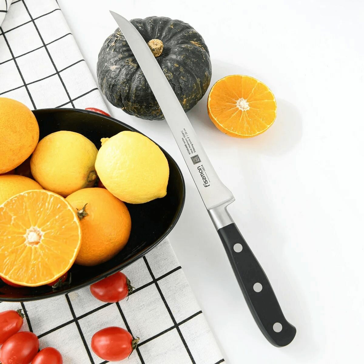 Кухонные ножи KITAKAMI FISSMAN сочетают в себе удобство, отменную остроту и долговечность. Они выполнены из высоколегированной немецкой стали X50CrMoV15, закаленной до 57 единиц по шкале Роквелла и имеют множество преимуществ Универсальный нож должен быть на каждой кухне. Его применяют для всех типов продуктов: рыбы, мяса, овощей и т.д. Варианты использования: нарезка, слайсирование, рубка, шинкование, измельчение и прочее. Толщина лезвия: 2,2 мм · Утолщенная пята клинка для защиты пальцев предотвращает соскальзывание пальцев на лезвие и обеспечивает дополнительный упор во время работы.· Повышенная прочность ножей обеспечивает длительный срок эксплуатации· Упор для фиксации руки· Заклёпки для надежной фиксации рукоятки из ABS к клинку· Благодаря матовому покрытию рукоять устойчива к скольжению и обеспечивает безопасную работу.· Цельнометаллическая конструкция ножа· Больстер из нержавеющей стали для балансировки ножа и равномерного распределения нагрузки во время работы.· Двусторонняя заточка лезвий обеспечивает легкую нарезку и разделку. Чтобы продлить срок службы ножа, его следует мыть вручную. Все ножи Kitakami поставляются в оригинальном, эксклюзивном, элегантном подарочном боксе. Что делает их уникальным, дорогим и очень привлекательным подарком на любой праздник! Выбирайте лучшее для своей семьи!
