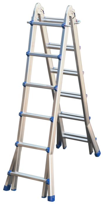 Лестница алюминиевая шарнирная телескопическая профессиональная двухсекционная. Профиль лестницы изготовлен из алюминиевого сплава, в соответствии с требованиями ГОСТ 22233, ступени выполнены с рифлением.